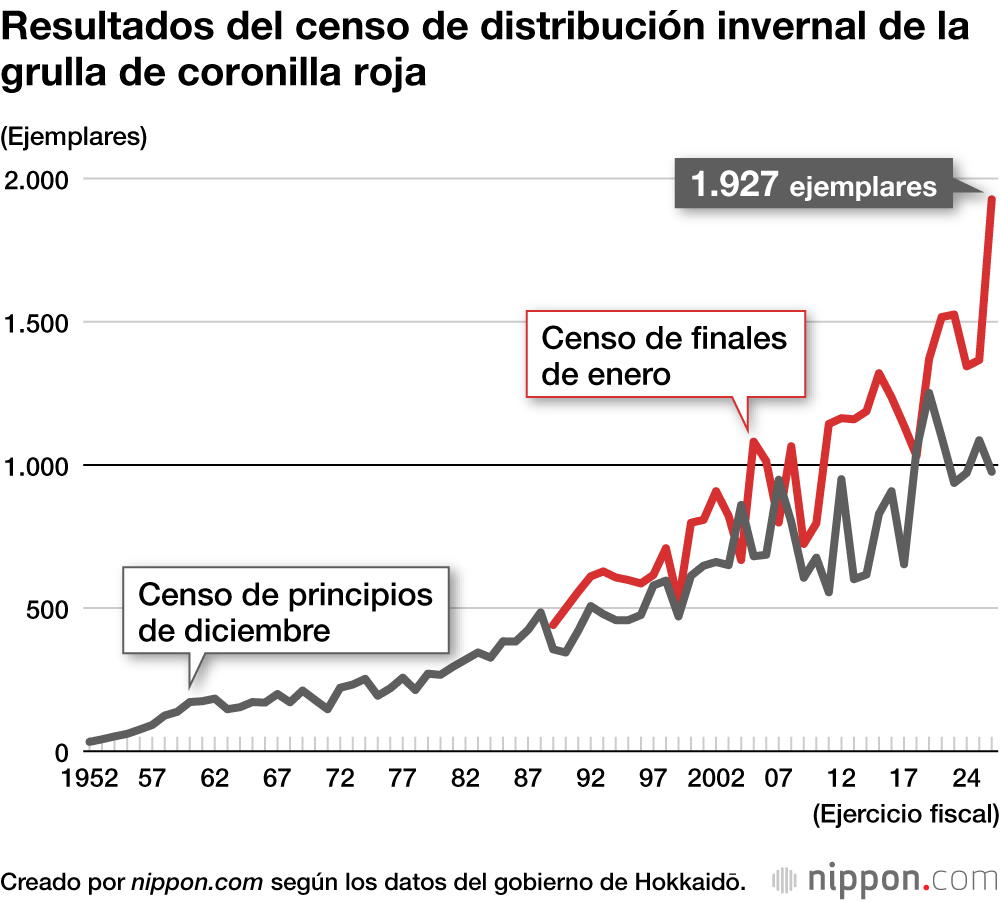 Se creía que la grulla de Manchuria se había extinguido debido a la caza excesiva durante la era Meiji (1868-1912); sin embargo, en 1924 se descubrieron varias decenas de ejemplares en las zonas más remotas del humedal de Kushiro. En el año fiscal 1952, cuando la “grulla de Kushiro” fue declarada Monumento Natural Especial, el censo invernal solo contabilizó 33 ejemplares. Posteriormente, los esfuerzos de protección y alimentación por parte de voluntarios, centrados en el pueblo de Tsurui y la antigua localidad de Akan (integrada en la ciudad de Kushiro en 2005), se intensificaron. En el censo del año fiscal 2024 (realizado a finales de enero de 2025), se confirmaron 1.927 ejemplares, lo que permitió evaluar el riesgo de extinción como bajo.