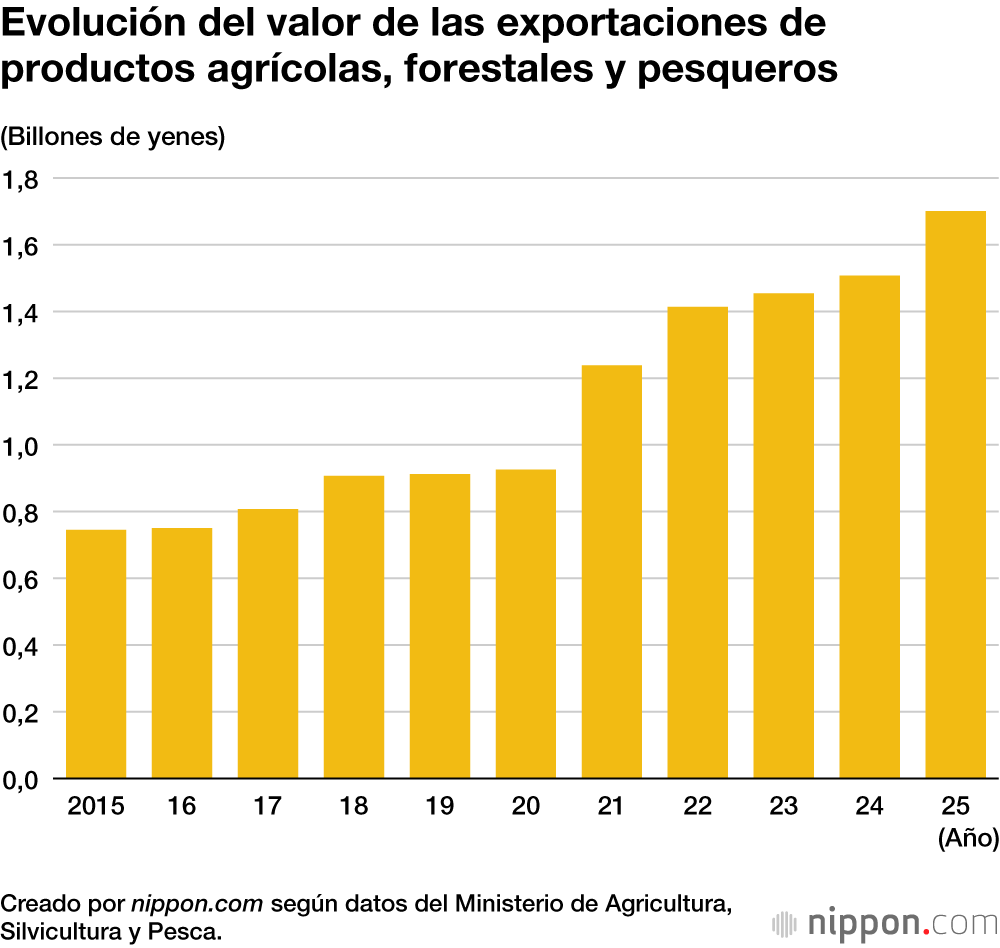 Según datos del Ministerio de Agricultura, Silvicultura y Pesca, el valor de las exportaciones de productos agrícolas, ganaderos y pesqueros, así como de alimentos, ascendió a 1,7 billones de yenes en 2025. Esta cifra supone un aumento de 2,3 veces con respecto a los 745.100 millones de yenes registrados hace 10 años, en 2015.