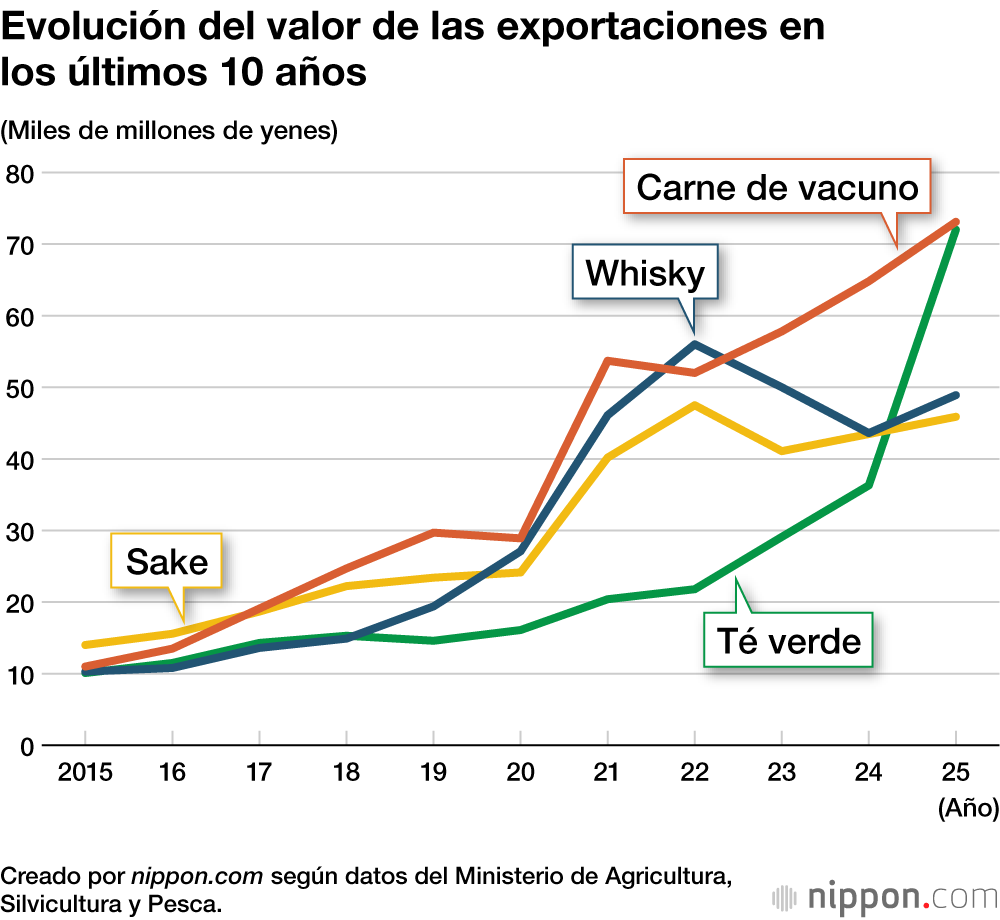 Lo que ha cambiado considerablemente con respecto a hace diez años es el auge de la carne de vacuno, el té verde, el sake y el whisky. En 2025, el valor de las exportaciones de carne de vacuno ascendió a 73.100 millones de yenes, 6,6 veces más que hace diez años, y su clasificación por productos pasó del puesto 13 al 2. El valor de las exportaciones de té verde y matcha se multiplicó por 7,1, y su clasificación subió del puesto 15 al 4. El matcha está acaparando la atención como superalimento con beneficios para la salud, y su demanda está aumentando rápidamente en su calidad de ingrediente para bebidas tipo matcha latte y dulces.