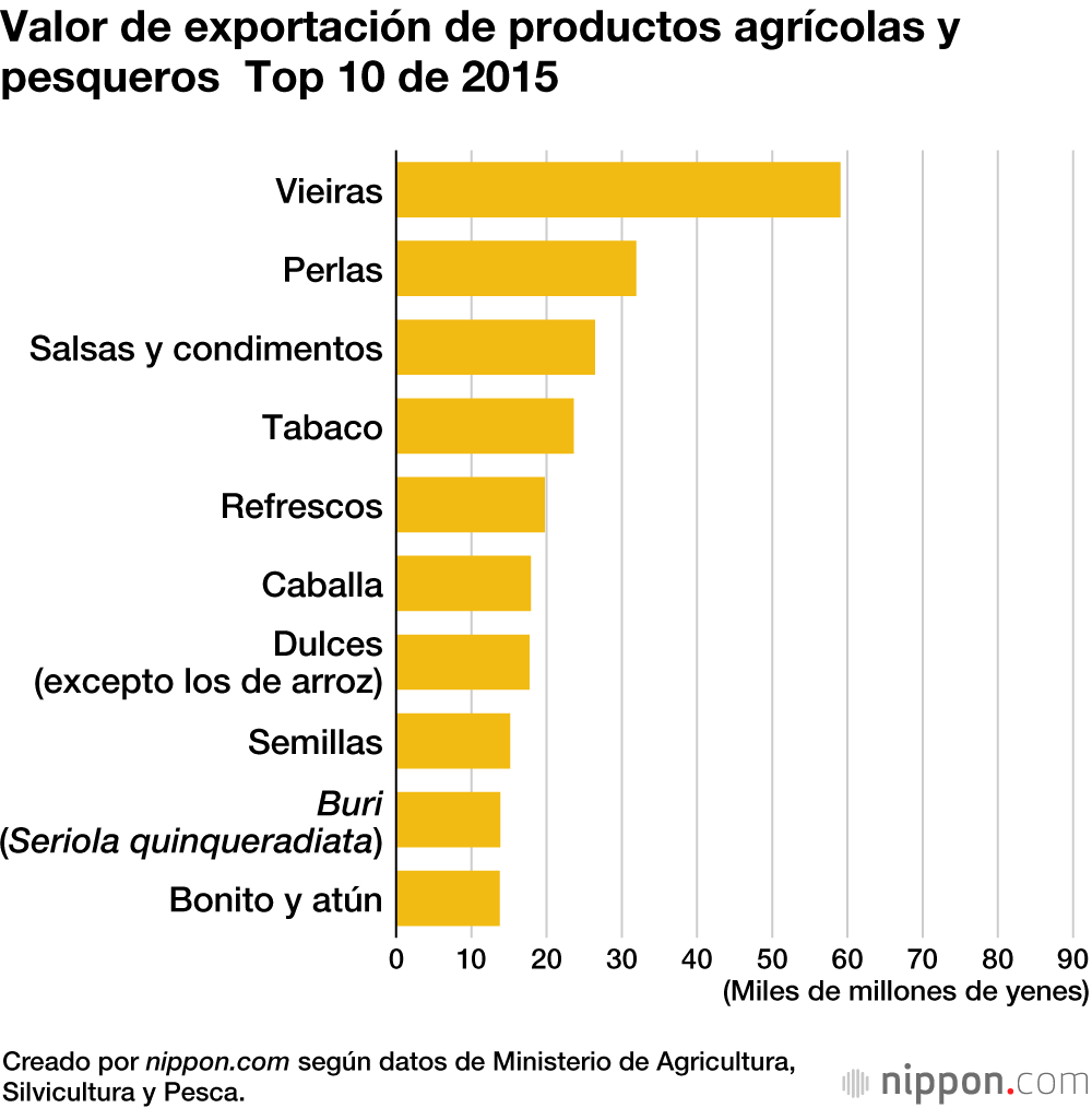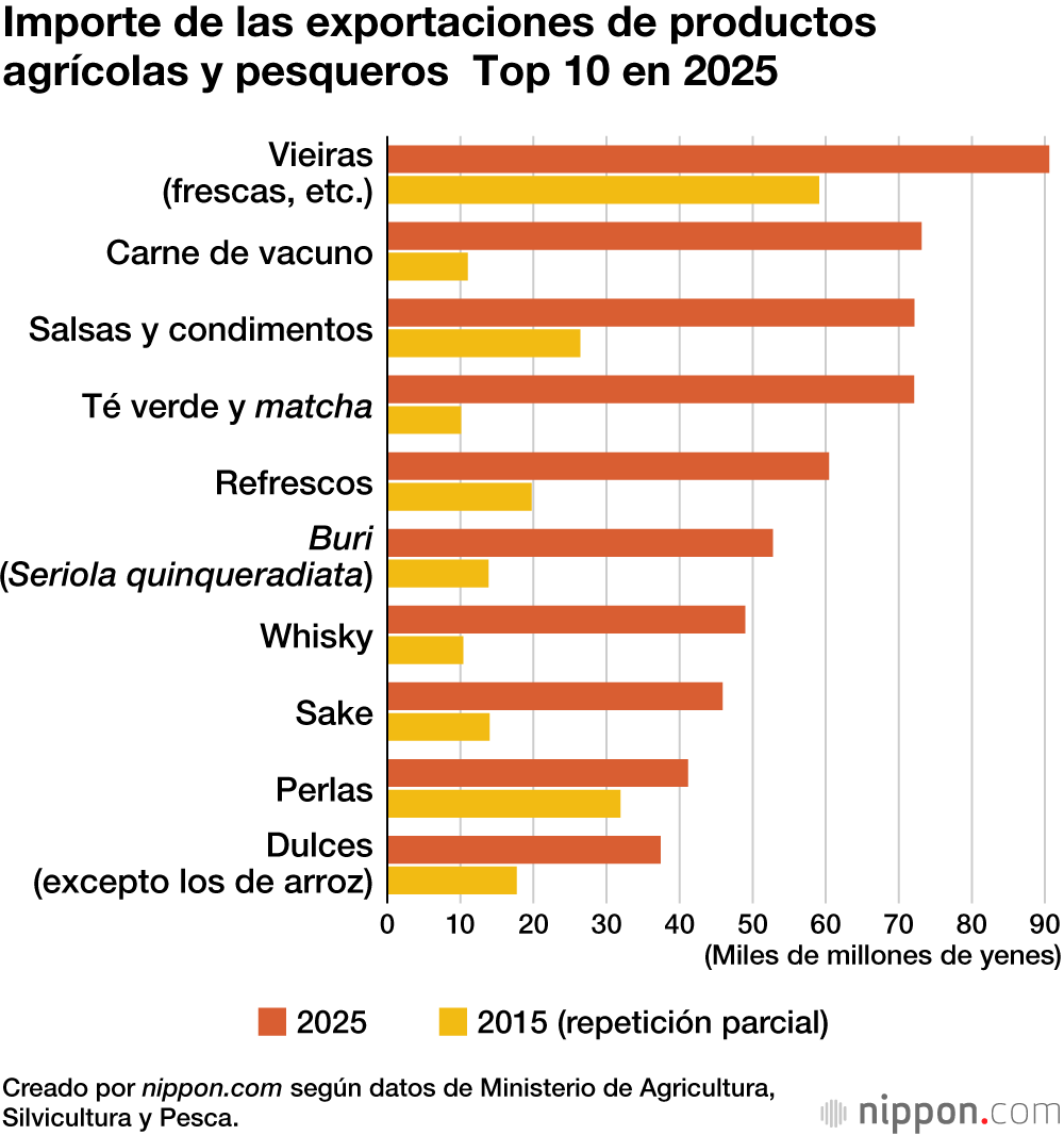 Por productos, la vieira sigue ocupando el primer puesto, al igual que hace diez años. China, que fue el principal destino de las exportaciones hasta 2022, impuso en agosto de 2023 una prohibición total de las importaciones de productos pesqueros japoneses a raíz del vertido de agua tratada de la central nuclear de Fukushima Dai-ichi, de la Compañía Eléctrica de Tokio (TEPCO). Aunque la prohibición se levantó finalmente en junio de 2025 gracias a los esfuerzos conjuntos del sector público y privado, se volvió a aplicar a partir de noviembre de 2025 debido al deterioro de las relaciones entre ambos países. No obstante, los productores han abierto nuevos mercados, principalmente en Vietnam, y la viera mantiene el primer puesto como producto más exportado.