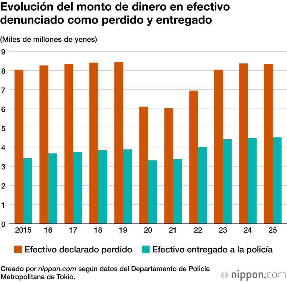 2025 marca un récord histórico en la cantidad de dinero en efectivo entregada a la policía de Tokio, por cuarto año consecutivo. Por otro lado, el monto total denunciado por los ciudadanos como perdido fue de 8.325 millones de yenes; un simple cálculo indica que el 54,2 % del dinero extraviado terminó siendo entregado a la policía.