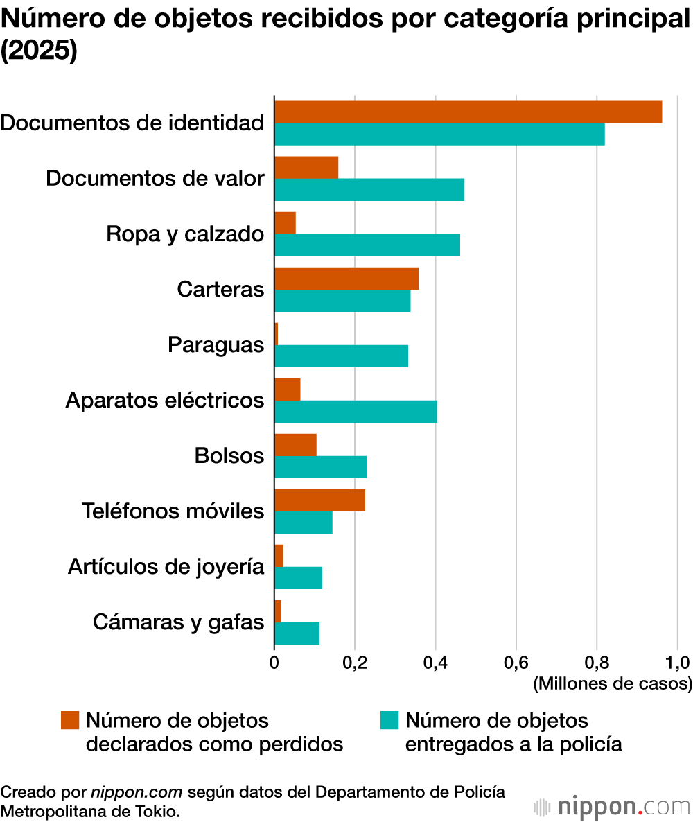 El volumen total de objetos y pertenencias entregados en las dependencias policiales alcanzó las 4.850.775 unidades, un 2,0 % más que el periodo anterior. Al analizar las categorías principales, la más numerosa fue la de “documentos de identidad”, que incluye licencias de conducir y tarjetas de crédito, con 819.602 unidades (el 16,9 % del total). Le siguen los “documentos de valor”, como tarjetas de transporte (tarjetas IC), abonos de transporte y vales de regalo, con 471.399 unidades (9,7 %); “ropa y calzado” con 460.667 unidades (9,5 %); “aparatos electrónicos” con 403.708 unidades (8,3 %); y “carteras” con 338.104 unidades (7,0 %).