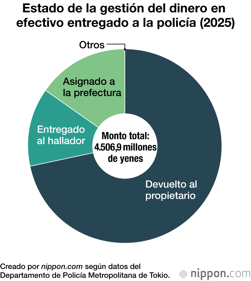 En cuanto a la situación del dinero en efectivo entregado en 2025, de los 4.500,7 millones yenes gestionados, se devolvieron alrededor de 3.229,6 millones de yenes a sus dueños originales. Por su parte, 586,8 millones de yenes fueron entregados a quienes los encontraron, mientras que 682,3 millones de yenes pasaron a formar parte del patrimonio de la metrópoli de Tokio.