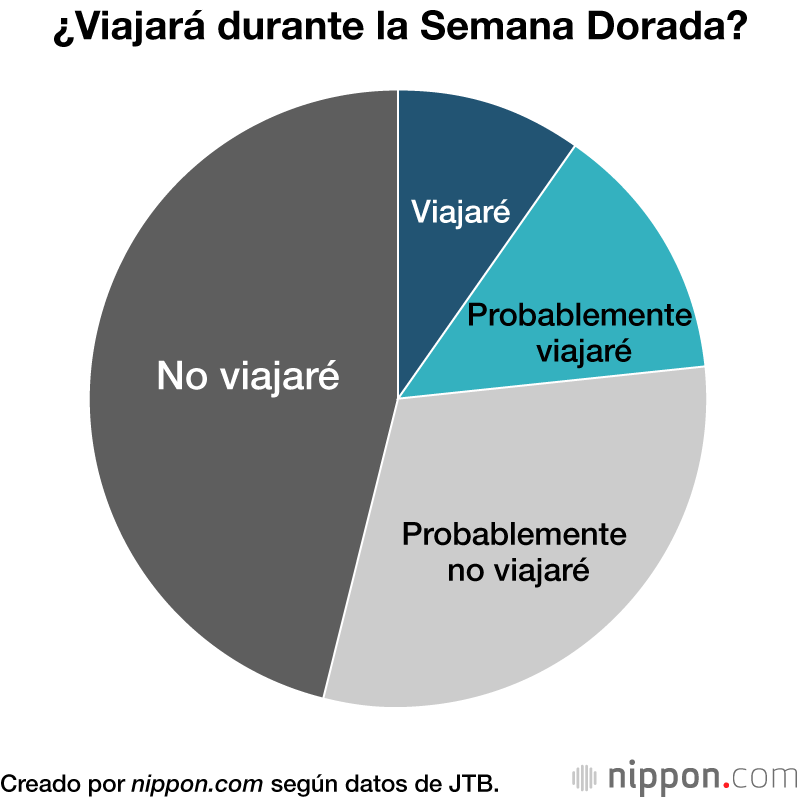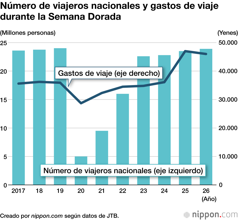 En 2026, el periodo vacacional de la Semana Dorada (Golden Week) constará de cinco días festivos consecutivos, del 2 al 6 de mayo. JTB realizó una encuesta entre el 6 y el 11 de marzo a 10.000 personas sobre sus intenciones de viaje en la Semana Dorada, durante un periodo de 13 días, del 25 de abril al 7 de mayo, que incluye los fines de semana y días laborables adyacentes. Según el estudio, el porcentaje de personas que respondió que “viajará” o “probablemente viajará” fue del 23,4 %, lo que supone un incremento de 2,5 puntos respecto al año anterior.