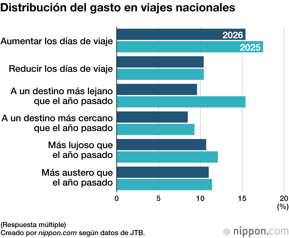Al preguntar sobre la distribución del presupuesto (respuesta múltiple), el porcentaje de quienes planean “aumentar los días de viaje” o “viajar más lejos” disminuyó en comparación con el año pasado. En cuanto a la duración, los viajes de “dos días y una noche” subieron al 39,9 % (6,4 puntos más), mientras que los de “cuatro días y tres noches” cayeron al 16,2 % (3,6 puntos menos). Además, la proporción de respuestas que prefieren “gastar dinero y viajar con lujo” fue superada por la de aquellos que optan por la “austeridad”, revirtiendo la situación del año anterior donde predominaba el deseo de lujo.