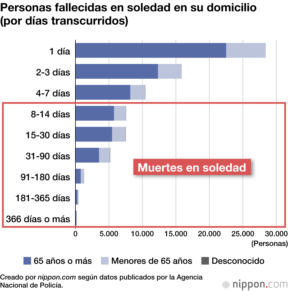 La Oficina del Gabinete estimó que, de esa cifra, 22.222 casos (casi el 30 % del total) pueden considerarse muertes en aislamiento (koritsushi), al haber sido los fallecidos hallados ocho días o más después del deceso. Aunque no existe una definición estandarizada de “aislamiento”, el Gobierno utiliza como criterio que, durante la semana previa al hallazgo, no se haya producido ningún contacto con terceros que pudiera haber alertado de la falta de comunicación, lo que permite inferir que la persona se encontraba socialmente aislada en vida. Los casos en los que el cadáver no fue descubierto hasta transcurrido más de un mes ascendieron a 7.148, lo que equivale aproximadamente al 9 %.