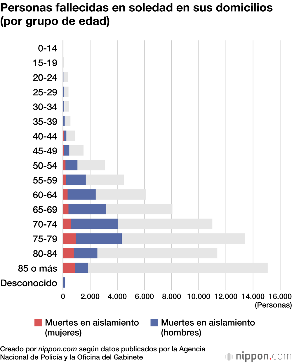 En cuanto a las muertes en aislamiento (koritsushi), destacan las franjas de 75 a 79 años (4.329 casos) y de 70 a 74 años (4.047). Por sexos, los hombres alcanzaron los 17.620 casos, 3,8 veces más que las 4.598 mujeres. El aumento de los hogares unipersonales, impulsado por el envejecimiento demográfico y la creciente tendencia a no contraer matrimonio, subyace a este fenómeno; no obstante, el aislamiento de los hombres de edad avanzada se ha vuelto especialmente crítico.