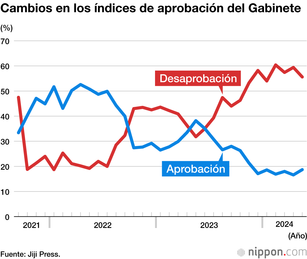 | Jiji Press | 55,6 % (-3,8) | Encuesta del día 10 al 13 |