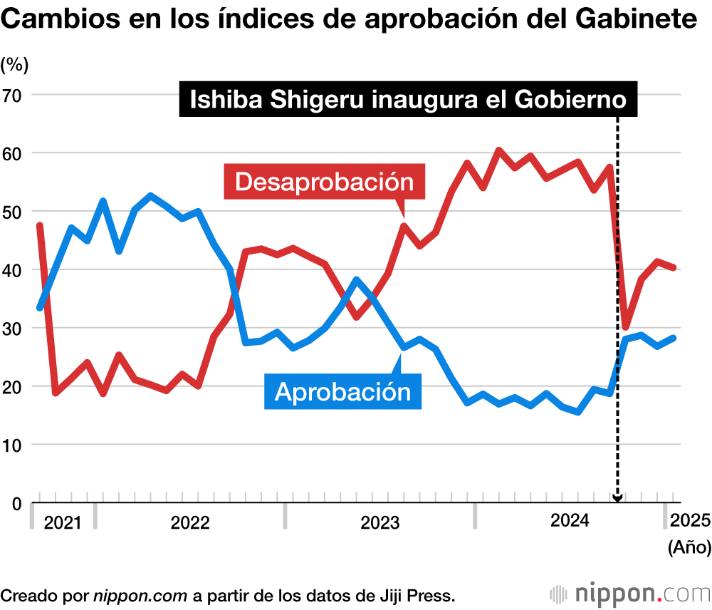 Según la encuesta de Jiji Press, el 28,2 % de los encuestados aprobaban el desempeño de Ishiba, 1,4 puntos más que en diciembre, mientras que el 40,3 % mostraba su desaprobación, un punto menos. La brecha entre estas calificaciones sigue siendo grande, 12,1 puntos, pero se ha reducido 2,4 puntos en términos mensuales.