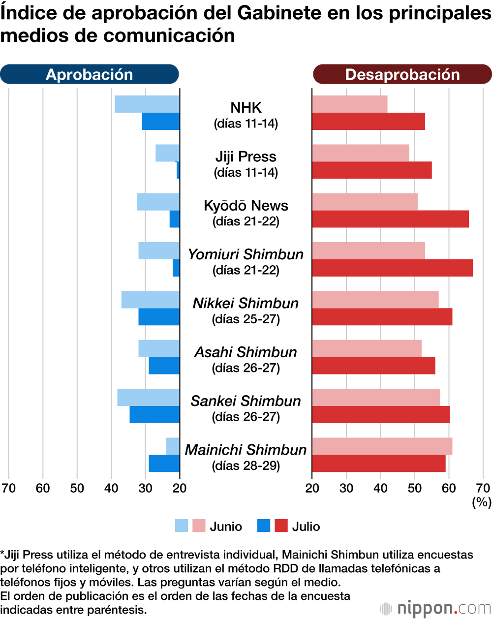 Una comparación exhaustiva entre todas las encuestas es difícil, ya que cada medio emplea métodos distintos, pero en conjunto, los índices de aprobación oscilaron entre el 34,6 % del Sankei Shimbun (el más alto) y el 20,8 % de Jiji (el más bajo). En junio, solo dos de los sondeos situaban a Ishiba por debajo del 30 % de apoyo; en julio, ese número aumentó a cinco.