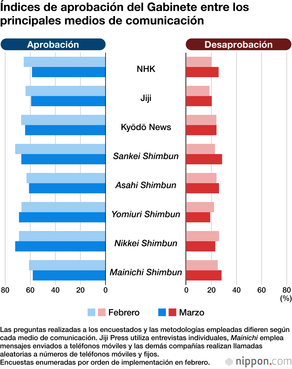 Las encuestas mensuales de opinión pública realizadas por los principales medios de comunicación de Japón revelaron en marzo de 2026 que la primera ministra, Takaichi Sanae, afrontó por fin un descenso en su popularidad. En el sondeo de la NHK, su índice de aprobación cayó 6,6 puntos, al igual que en las encuestas del diario Sankei Shimbun (4,9 puntos menos) y de la agencia Jiji Press (4,5 puntos menos), así como, en menor medida, en las de Kyodo News, Asahi Shimbun y Mainichi Shimbun. En seis de estas ocho encuestas, Takaichi había registrado un aumento en febrero, impulsada por la victoria del Partido Liberal Democrático en las elecciones a la Cámara de Representantes (Cámara Baja), pero esta vez la tendencia se invirtió.