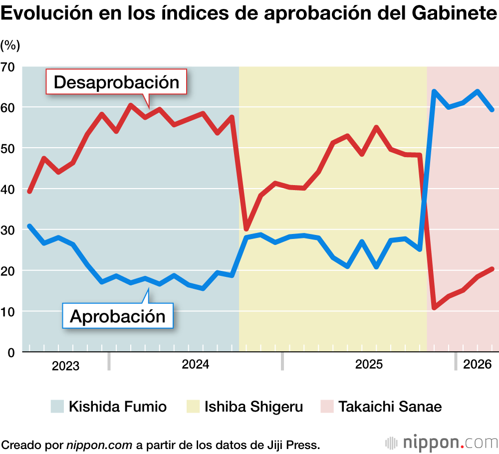 Las encuestas de Jiji Press a lo largo de los cinco meses que Takaichi lleva en el poder muestran que ha mantenido un sólido nivel de apoyo en torno al 60 %. Esta cifra es aproximadamente el doble de la que registraba Ishiba Shigeru en octubre de 2025, al final de su mandato, y el triple de la de Kishida Fumio justo antes de que su administración llegara a su fin en septiembre de 2024.