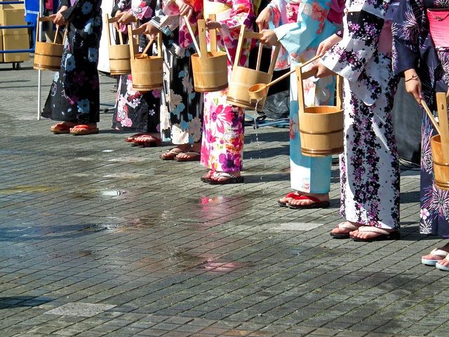 En los últimos años, se han dado bastantes casos de golpes de calor en Japón, motivo por el cual es necesario protegerse con una sombrilla o un gorro y tomar mucha agua y sal cuando el calor aprieta. En las primeras horas de la mañana y por la tarde, es frecuente ver a gente regando los jardines o echando agua en el asfalto y a la puerta de los establecimientos; esta costumbre, denominada “uchimizu”, data de tiempos antiguos. Aunque originalmente es un rito sintoísta de purificación, se ha demostrado también que ayuda a bajar la temperatura de las zonas aledañas.