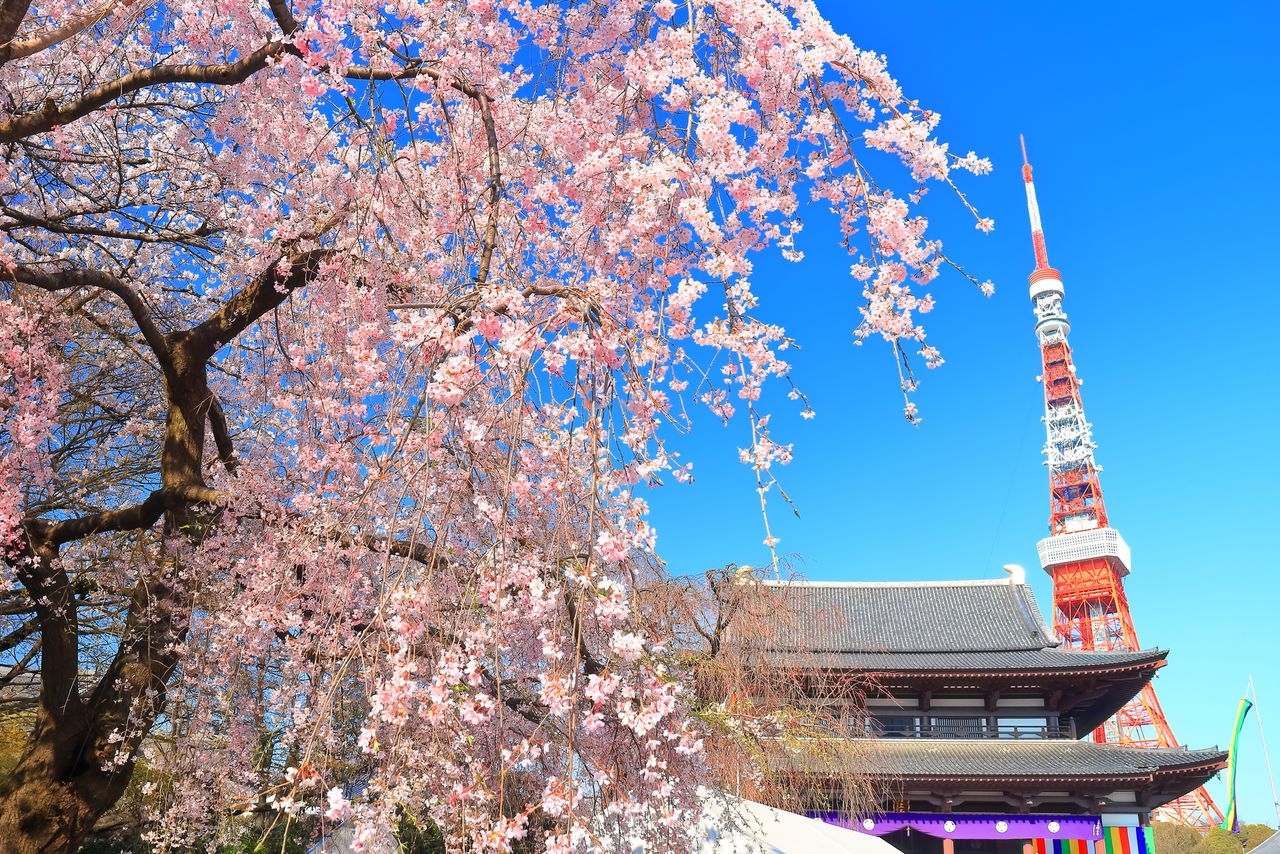 Flores de cerezo llorón en el Templo Zōjōji y la Torre de Tokio.