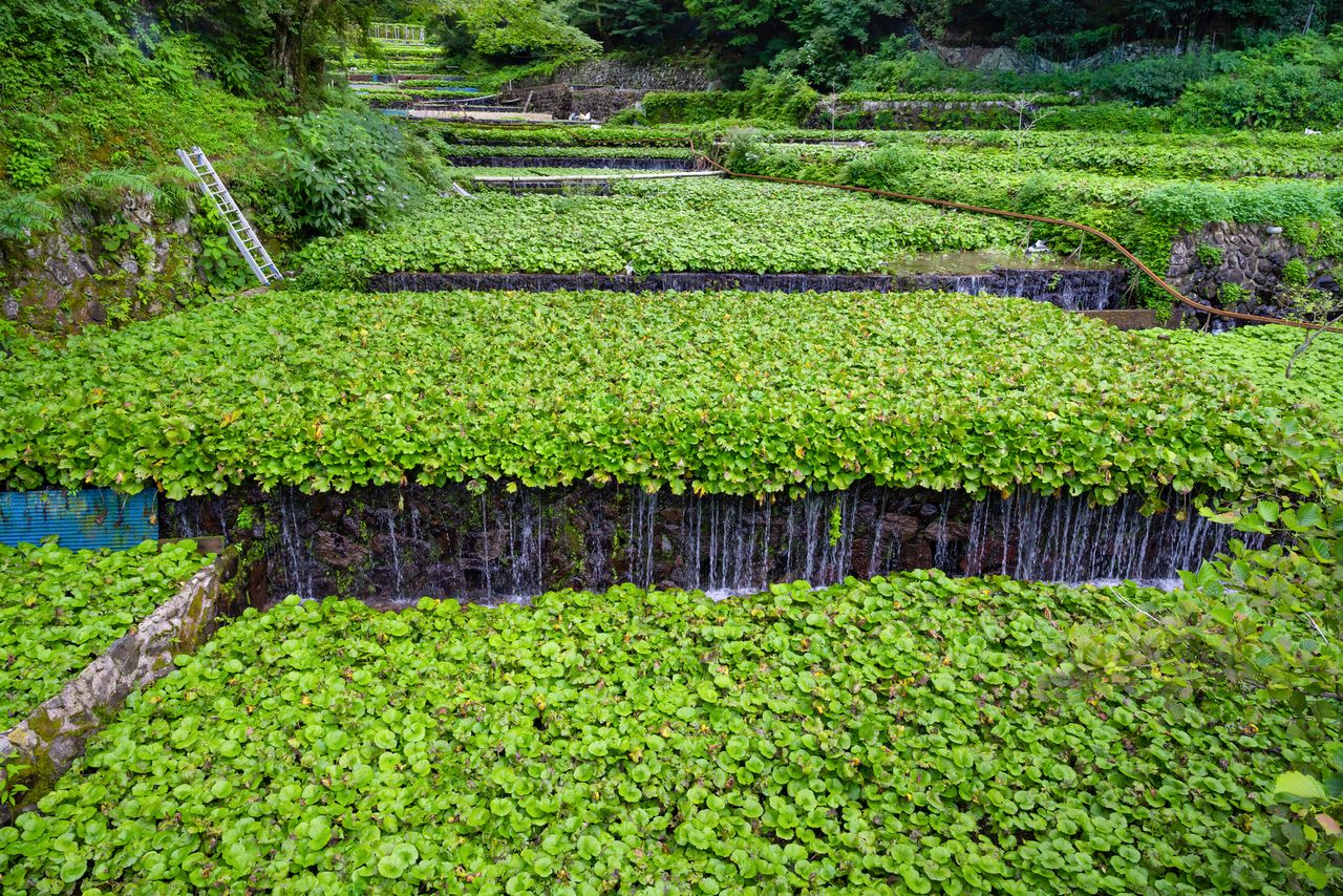 Campos de wasabi de Ikadaba, en Izu (Shizuoka). Han sido declarados Sistemas Importantes del Patrimonio Agrícola Mundial. (Pixta)