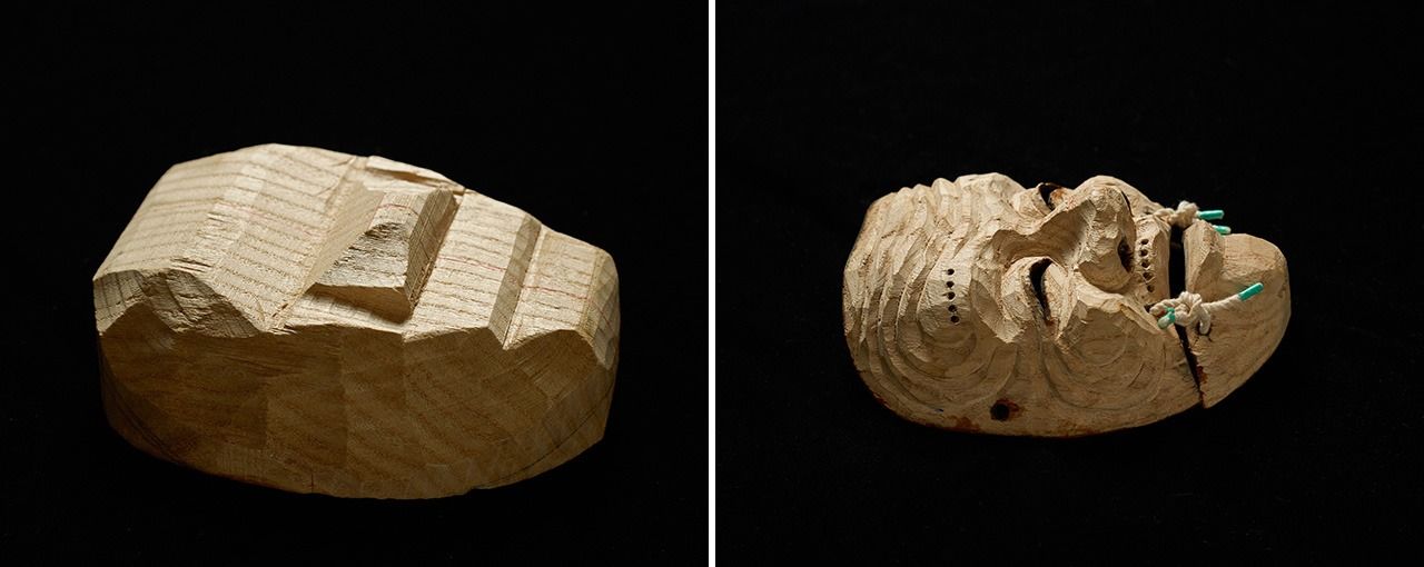 Primeros pasos del tallado de la máscara okinamen. (Kuratani Kiyofumi)