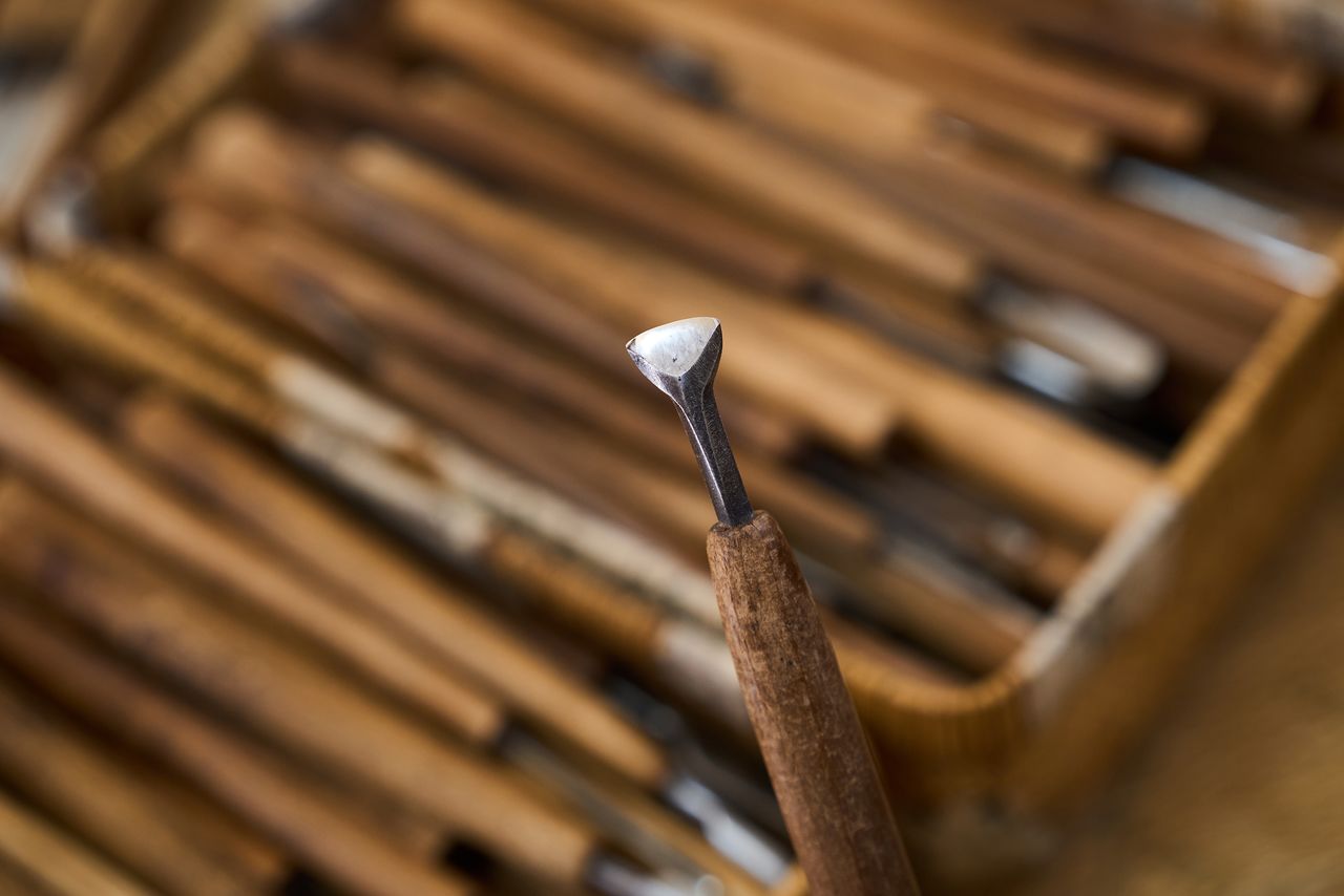 Algunas de las variadas herramientas de tallado utilizadas por Kitazawa. Cada fase del proceso de producción exige hojas diferentes. (Kuratani Kiyofumi)