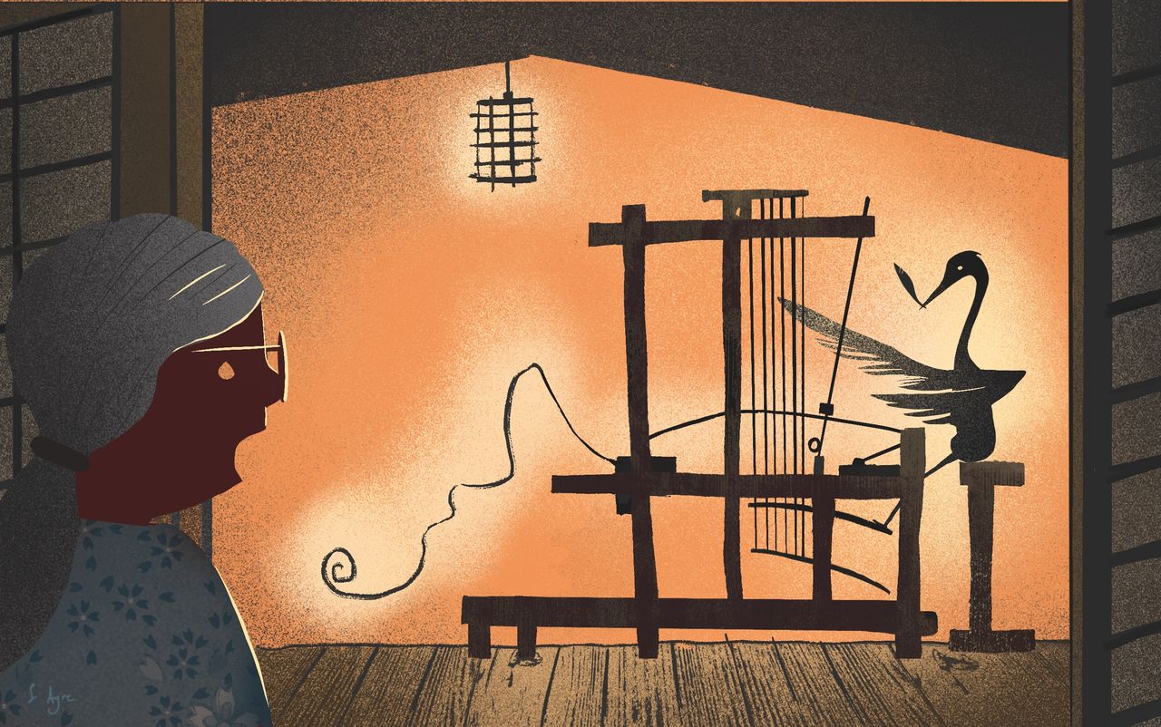 A la pareja le costó convencerla, pero finalmente la joven accedió. Cada día, el anciano llegaba antes a casa después de recoger leña, pues estaba ansioso por ver el siguiente rollo de tela. La tercera noche, la pareja de ancianos susurraban preguntándose cómo le era posible producir un material tan magnífico en su ordinario telar. “Podríamos abrir la puerta un poquito”, propuso el hombre. “Seguro que no se da cuenta”.