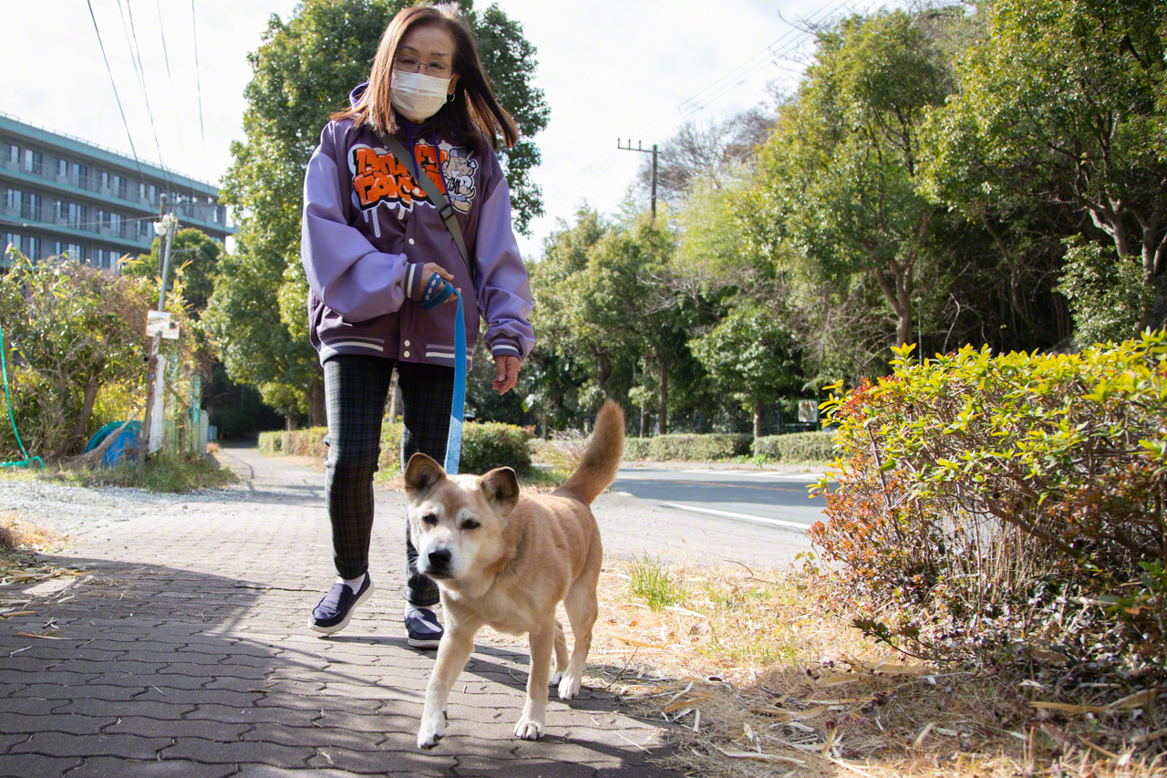 Una voluntaria lleva a Bunpuku a pasear, una actividad que el perro disfruta muchísimo.