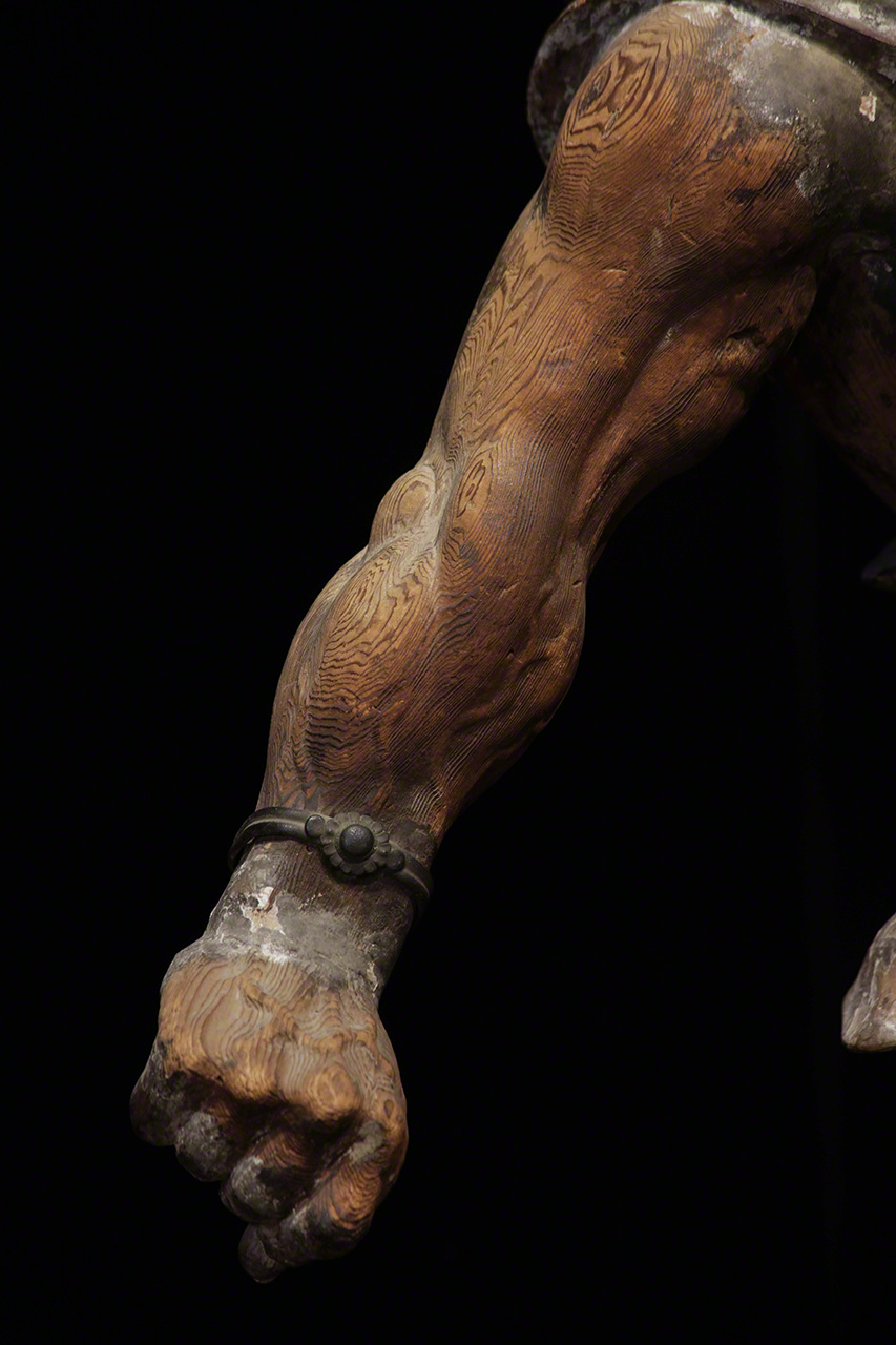 El brazo derecho, poderoso y tensado por el apretado puño, el torso, muy musculado, como el resto de su vigorosa anatomía, causan un fuerte impacto visual. Aunque la pierna izquierda parece clavada en el suelo, soportando todo el peso, si nos fijamos bien su primer dedo está levantado. Este pequeño detalle dinámico contribuye a realzar la pesadez de la lámpara. El cuidado que prestó el tallista al más mínimo detalle es cuando menos asombroso, incluyendo la tosca piel de animal que lleva por encima del taparrabos.