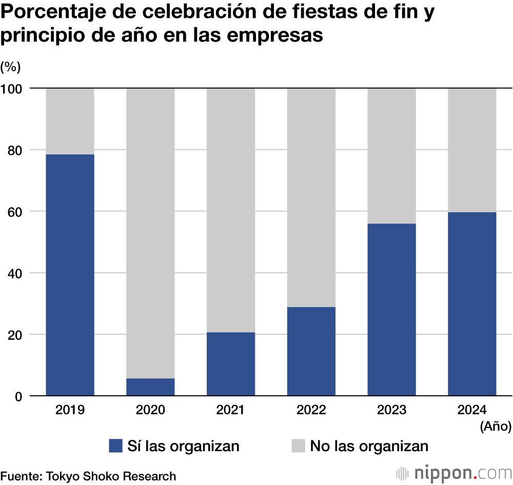 Sin embargo, actualmente la situación está cambiando. Según una encuesta de Tokyo Shoko Research, en 2024 solo un 59,6 % de las empresas celebró fiestas de fin y principio de año, casi 20 puntos menos que en 2019, antes de que estallara la pandemia. “No hay mucha demanda” y “Cada vez más empleados las eluden” son algunos de los motivos que justifican que los nomikai no hayan recuperado la prevalencia del pasado a pesar de que las medidas preventivas contra la COVID-19 ya prácticamente se hayan erradicado.