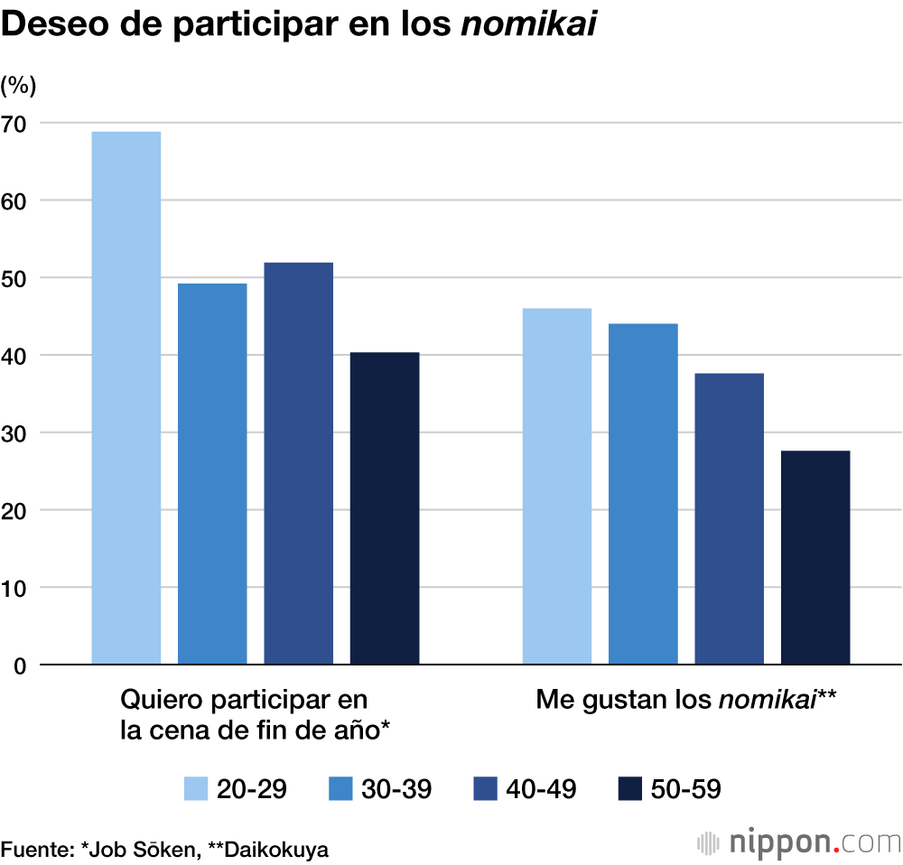 Según la encuesta de percepción social que llevó a cabo la entidad investigadora Job Sōken sobre datos de movilidad laboral en 2024, fueron muchos menos los encuestados en la franja de 40 a 59 años (51,9 % en la cuarentena y 40,3 % en la cincuentena) que respondieron que deseaban participar en la cena de fin de año que en la franja de 20 a 29 (68,8 %). Otra encuesta realizada en 2023 por la empresa financiera Daikokuya (prefectura de Nagasaki) corroboró que el porcentaje de trabajadores en la cincuentena (27,6 %) que respondieron que les gustaban los nomikai laborales era casi 20 puntos más bajo que el de aquellos en la veintena (46 %).