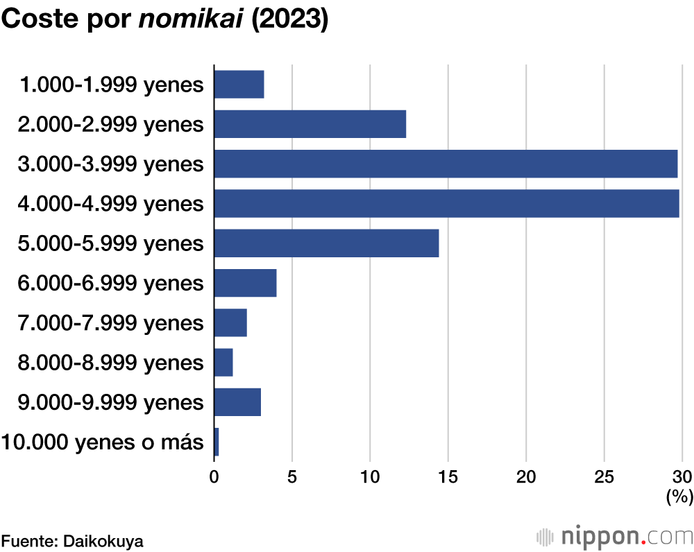 En su directriz sobre la relación entre el consumo de alcohol y la salud publicada en febrero de 2024, el Ministerio de Sanidad, Trabajo y Bienestar estima que la cantidad de alcohol que eleva el riesgo de padecer cáncer de colon es de unos 20 gramos de alcohol puro al día (equivalente a 500 mililitros de cerveza), dato que está contribuyendo a que cada vez más personas de todas las edades tomen conciencia de la relación entre el consumo de alcohol y la salud. Según la encuesta de Daikokuya de 2023, en Japón las personas que forman parte de la población trabajadora participan en una media de 17 nomikai al año, con un gasto medio de 4.237 yenes por cena. Con la subida continua de los precios, no son pocos los que reducen su participación en este tipo de actos.