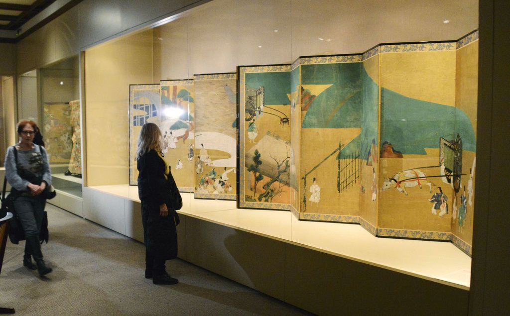 Biombo de Tawaraya Sōtatsu (tesoro nacional) expuesto en una exposición sobre Genji monogatari celebrada en el Museo Metropolitano de Arte de Nueva York. (Kyōdō)