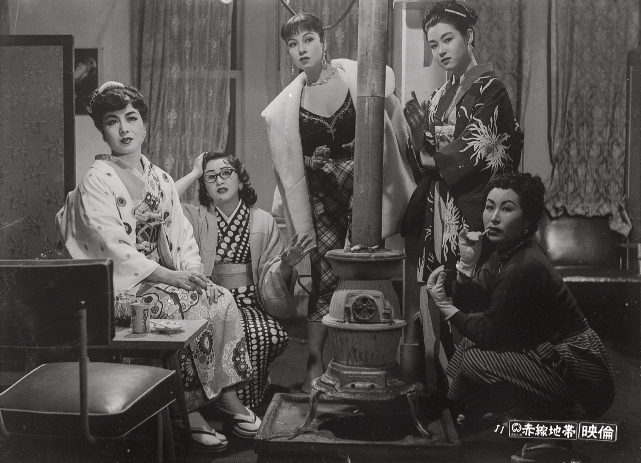 Akasen chitai (La calle de la vergüenza, 1956), el último trabajo de Mizoguchi Kenji. Wakao es la segunda por la derecha. En el centro, Kyō Machiko © KADOKAWA 1956.