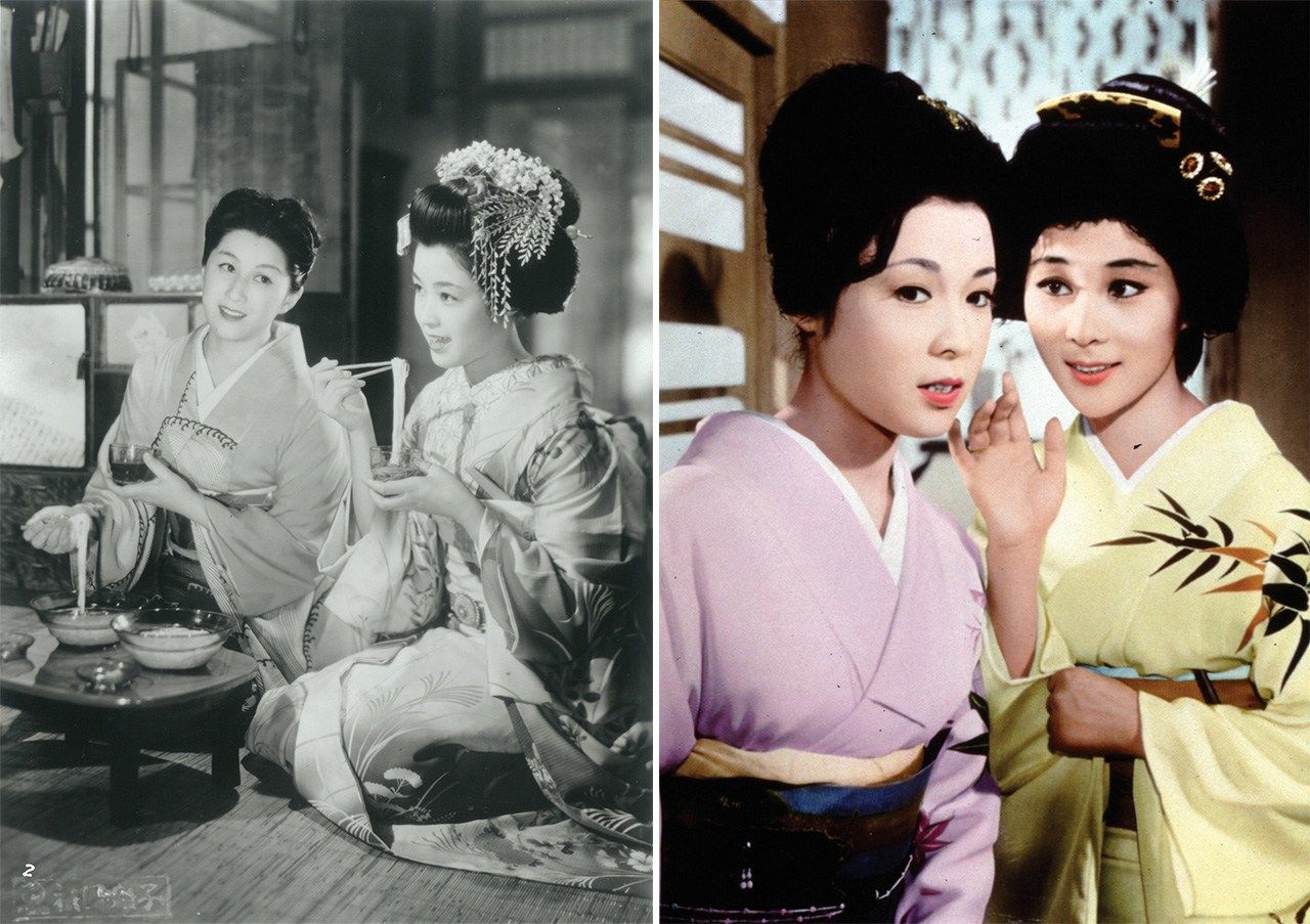 Izquierda: Wakao comienza su carrera como maiko tras ocho años bajo la tutela de la geisha Miyoharu (Kogure Michiyo, a la izquierda), en Gion bayashi (1953), de Mizoguchi Kenji. Derecha: En Onna wa nido umareru (1961), de Kawashima Yūzō, Wakao es una geisha fácil y sin artes a quien no le queda más remedio que acostarse con uno de sus clientes © KADOKAWA 1953 / © KADOKAWA 1961.