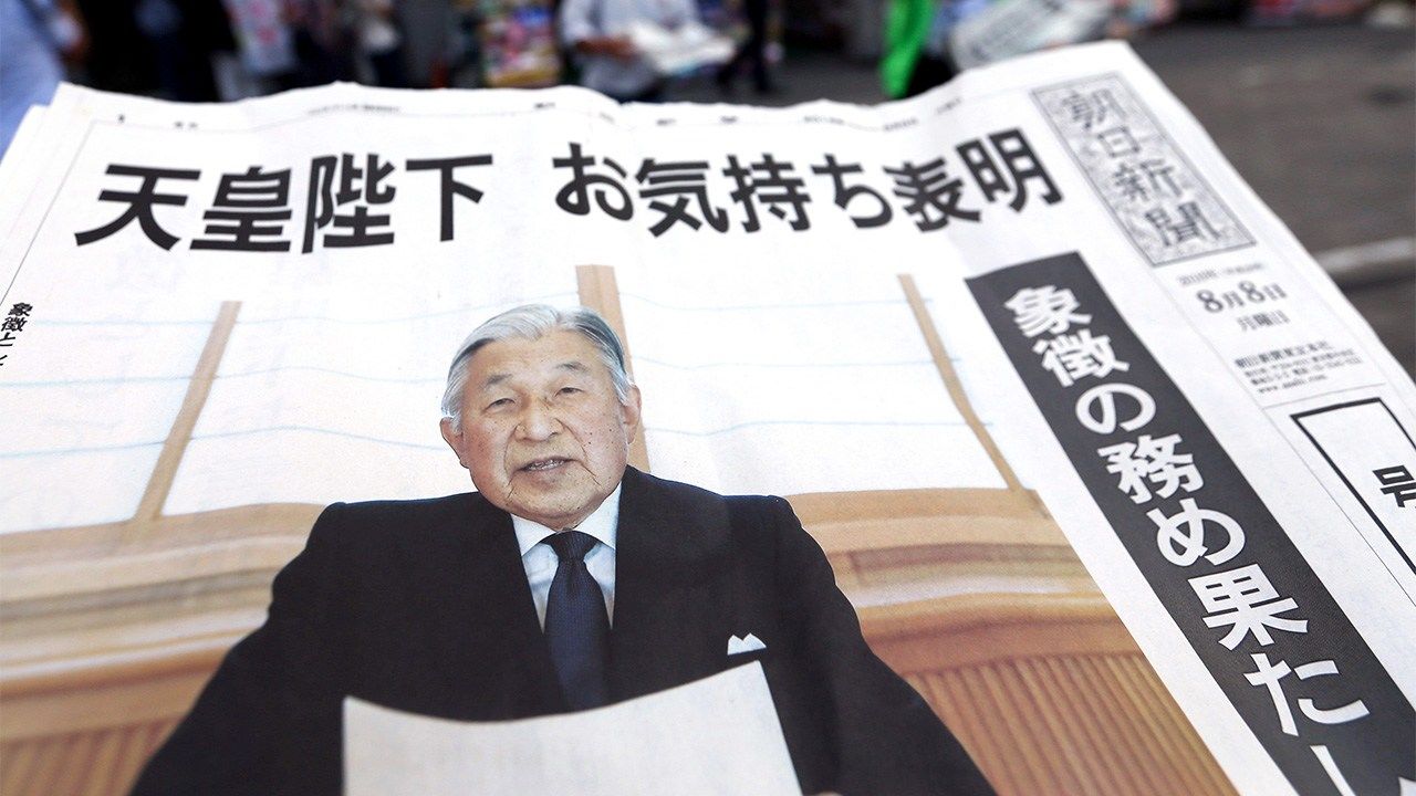 Fotografía del encabezado: reparto callejero de una edición especial con motivo del videomensaje del Emperador en el que expresaba su intención de abdicar. Fotografía tomada el 8 de agosto de 2016 junto a la estación ferroviaria de Shinbashi en Minato-ku (Tokio). (Jiji Press)