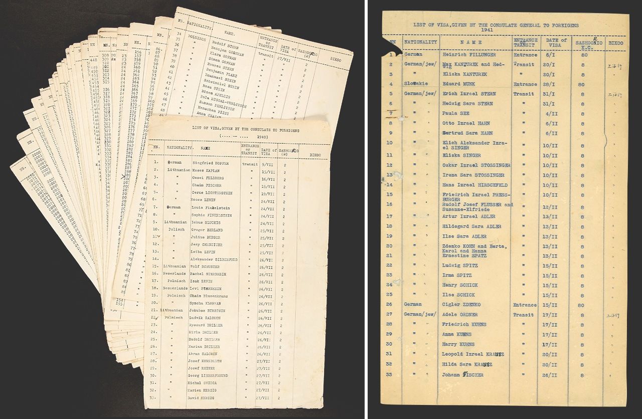 A la izquierda, la lista de los visados concedidos en Kaunas confeccionada por Sugihara durante su estancia en Praga. Incluye 2.140 nombres (cortesía del Ministerio de Asuntos Exteriores de Japón). A la derecha, la lista de los visados concedidos por Sugihara desde Praga, con 36 nombres (ídem). La segunda es mucho más corta, pero ha de tenerse en cuenta que Sugihara no dejó registro de muchos casos en que concedió visado a personas que incumplían los requisitos oficiales.