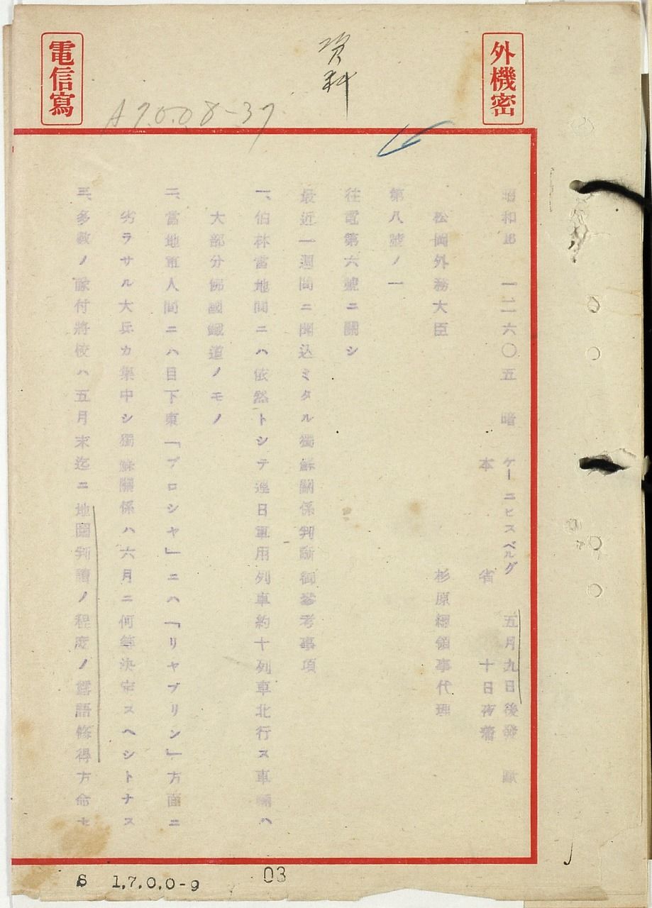 Telegrama enviado al Ministerio de Asuntos Exteriores de Japón por Sugihara el 9 de mayo de 1941 desde la entonces alemana Köningsberg, en el que da cuenta de los preparativos alemanes para invadir la Unión Soviética. (Fotografía cortesía del Ministerio de Asuntos Exteriores)