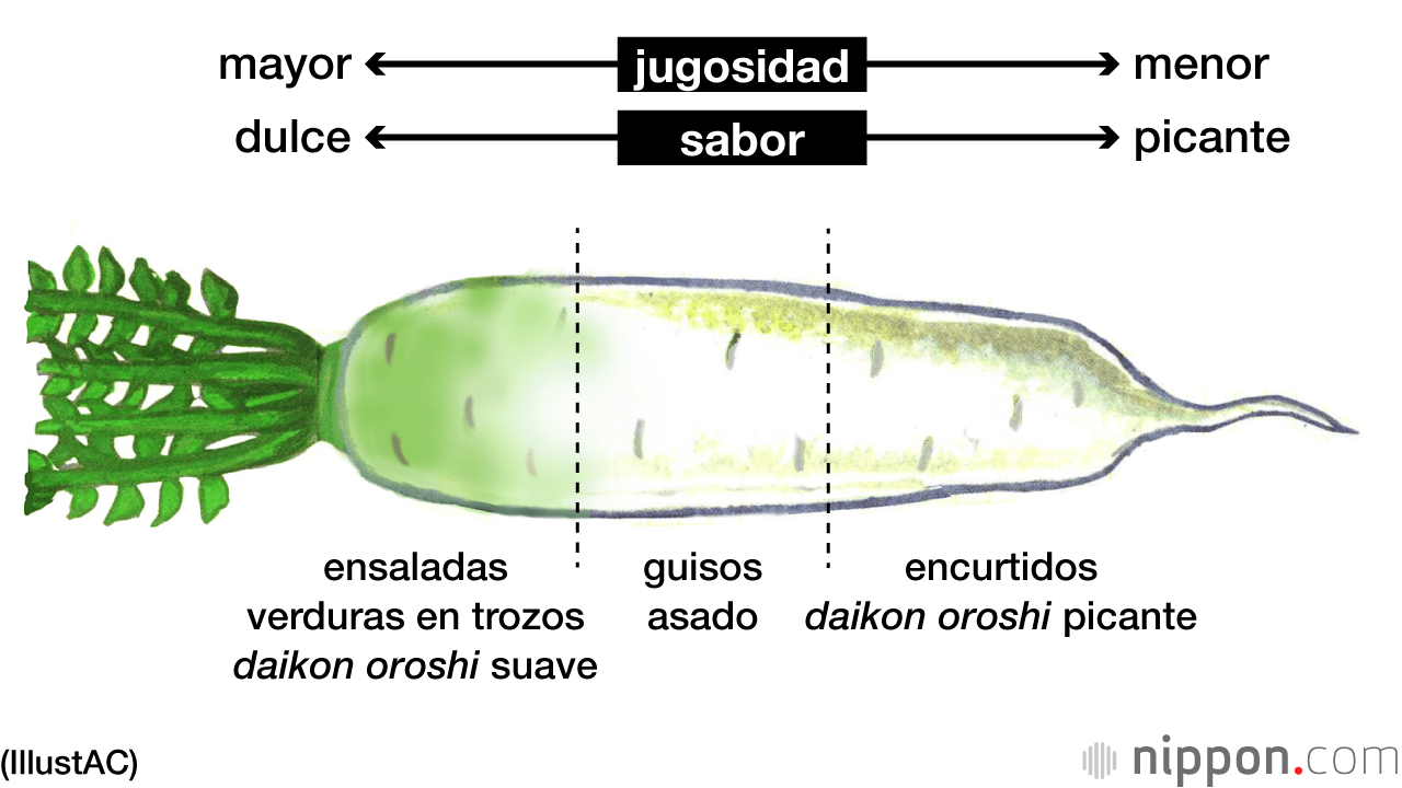 Si prepara daikon oroshi o rallado con la parte superior, se conseguirá un sabor suave. Si lo que se busca es darle un toque refrescante a pescados asados con alto contenido de grasa, como el buri (Seriola quinqueradiata, familia de los carángidos), es mejor usar la punta, de gusto picante. Quien conoce estas diferencias, ya es un experto.