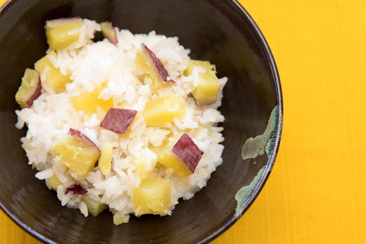 Para preparar este plato se cuecen camotes picados en cubos junto con el arroz. Su dulzor forma parte de los sabores característicos del otoño.
