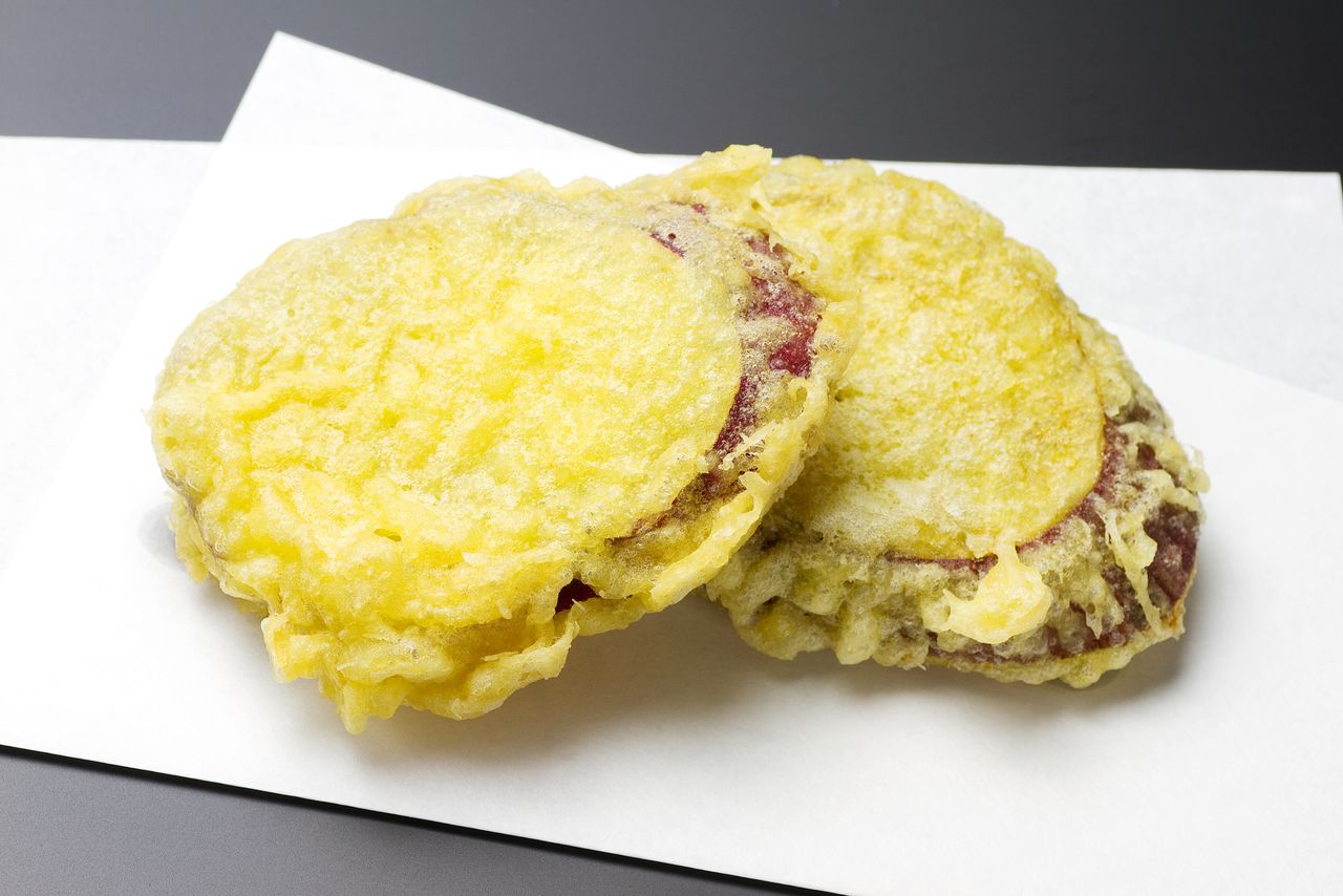El camote es un ingrediente muy socorrido para la tempura. Se recomienda poner una pizca de sal a la tempura de camote recién hecha.