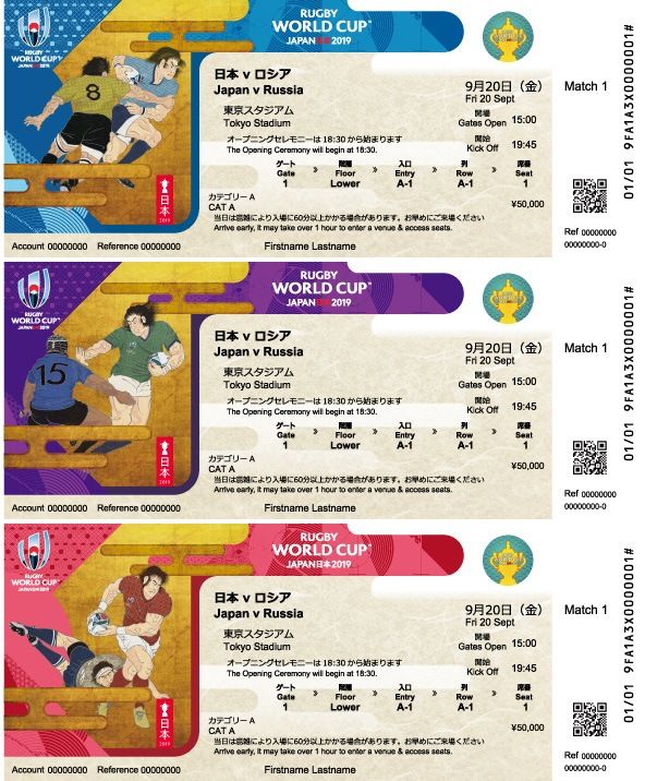 El 17 de junio de 2019 el Comité Organizador de la Copa Mundial de Rugby 2019 reveló los diseños de las entradas para este campeonato que comenzará en Japón el 20 de septiembre. El estilo musha-e, un popular género de ukiyo-e (xilografías) que refleja los devenires de los samuráis, fue la fuente de inspiración para las ilustraciones de los “guerreros” del rugby realizando placajes y rechazos. Las entradas se venderán en tres colores: violeta, rojo y azul.