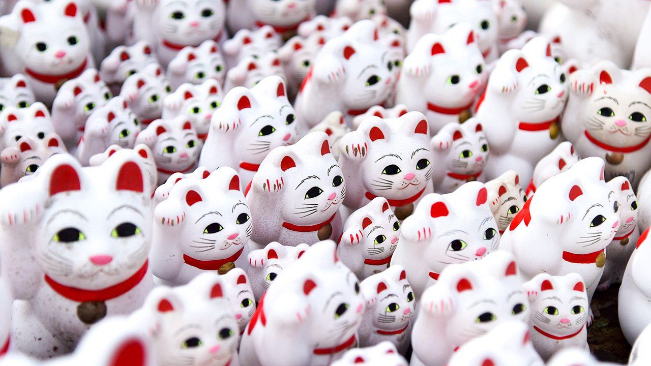 (Texto original en español. Fotografía del encabezado: un conjunto de maneki-neko en el templo Gōtokuji.)