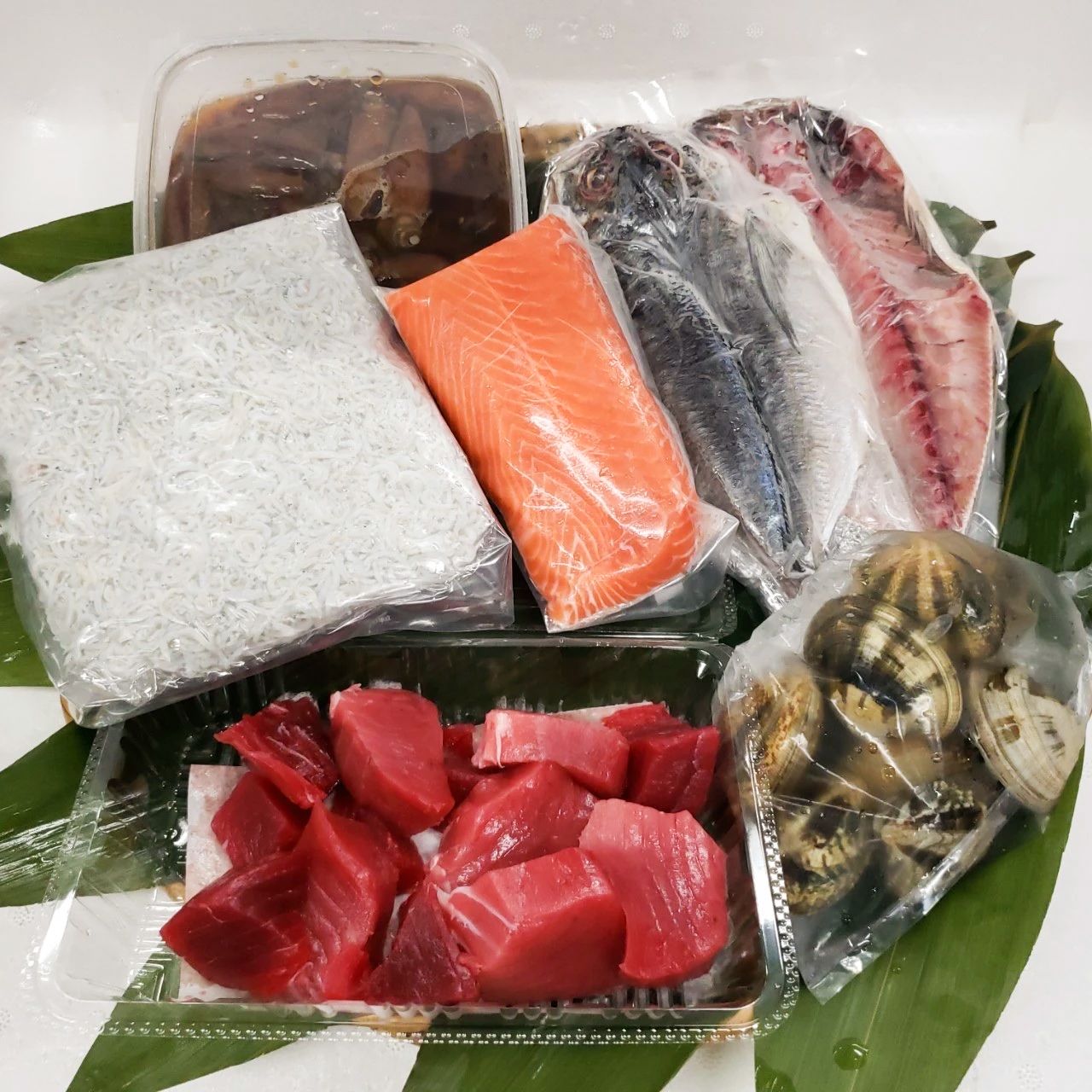 Lote Chokottozutsu, que incluye una selección de los productos más recomendados por Otatsu Shōten: atún rojo del Atlántico en butsu (trozos gordos), salmón, alevines escaldados y jurel abierto en canal, entre otros (imagen de Otatsu Shōten).