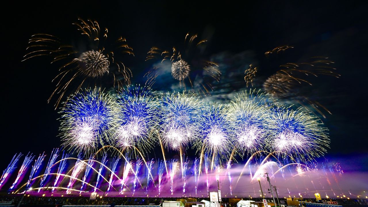 Ōmagari no Hanabi. En este caso, los fuegos artificiales de lanzamiento rápido sucesivo tiñen de color el cielo nocturno (Pixta).