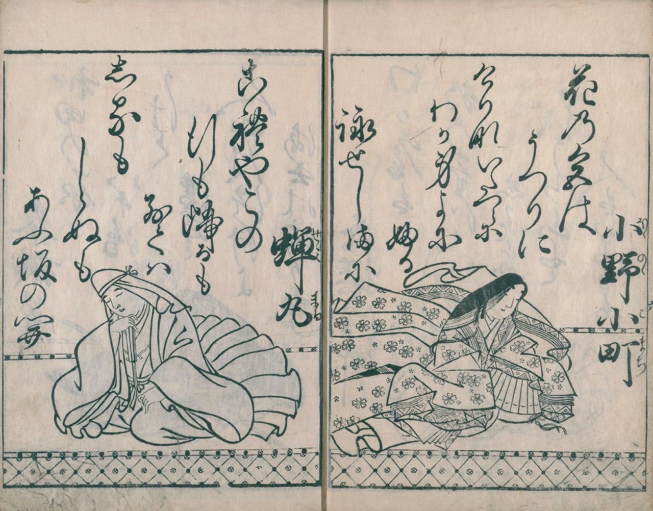 Poema de Ono no Komachi en Hyakunin Isshu (Cien poemas de cien poetas), publicado en 1680 por Hishikawa Monorobu (imagen del sitio web de la Biblioteca de la Dieta).