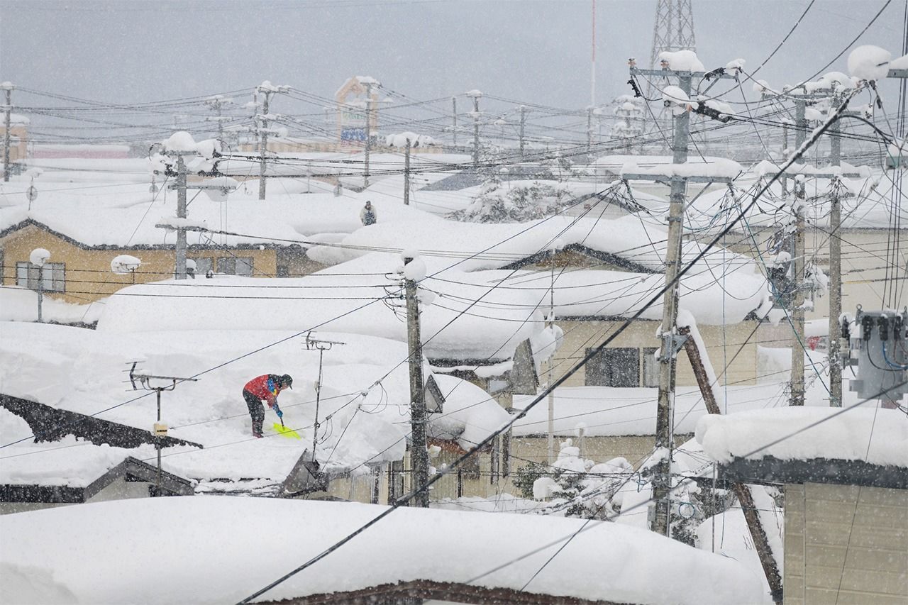 Una persona retira la nieve de un tejado en Yuzawa (Pixta).