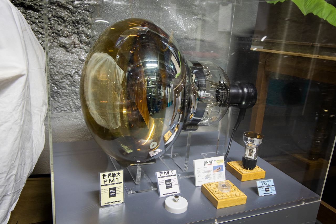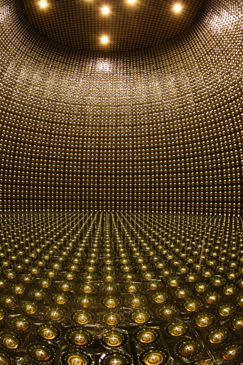 La pared interior del depósito está cubierta con 11.129 fotomultiplicadores (sensores ópticos) gigantes con forma de bombilla de 50 centímetros de diámetro. Cada uno de ellos tiene tal sensibilidad que sería capaz de detectar el haz de luz de una linterna proyectado desde la Luna. El cristal fue elaborado con todo el cuidado por artesanos y la superficie se revistió con una película metálica, dorada y brillante (cuando no está en mantenimiento, el depósito se encuentra en total oscuridad, por lo que no es posible observar las más de 10.000 esferas doradas).