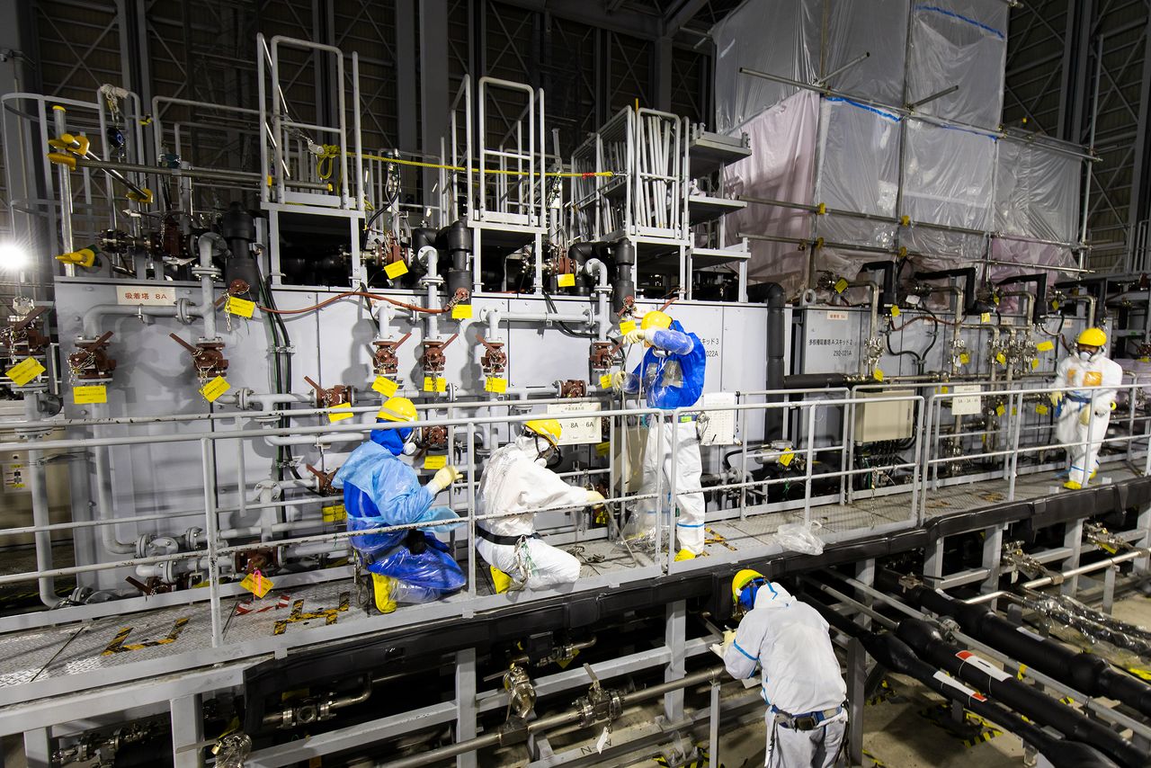 En el interior del ALPS, un sistema que extrae 62 tipos de sustancias radiactivas del agua contaminada. Los operarios trabajan a buen ritmo a pesar del aparatoso equipo de protección con el que van forrados, compuesto por traje, mascarilla completa y dos pares de guantes.