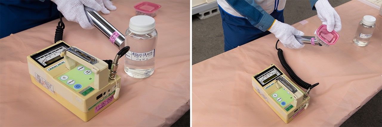 El agua de la fotografía de la izquierda es agua tratada con el ALPS. Al acercar el medidor de radiación, aparece un valor de 1. En la imagen de la derecha, un recipiente de plástico lleno de bolitas de radón, que se venden como producto de salud y belleza para aportar al baño doméstico los efectos de las aguas termales, da una lectura de 3.