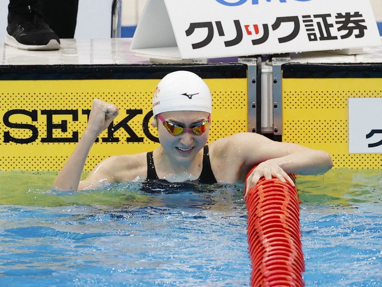 Ikee Rikako, exultante al reunir su cuarto oro en el Campeonato de Natación de Japón con su victoria en los 50 metros libres, el 10 de abril de 2021. (Jiji Press)