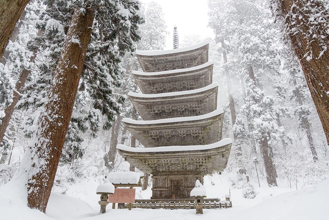 La pagoda de cinco pisos que se alza junto al camino que lleva hacia el santuario del monte Haguro. La más antigua en su género de la región de Tōhoku, está catalogada como tesoro nacional. (PIXTA)