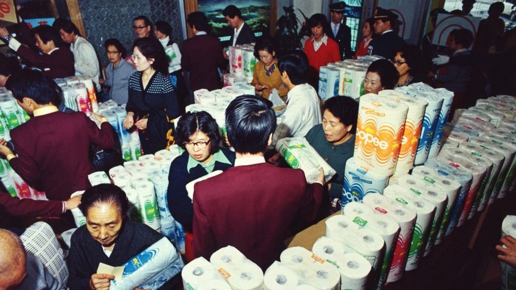 (Artículo traducido al español del original en japonés. Imagen del encabezado: clientes de un supermercado de Osaka compran papel higiénico en grandes cantidades durante el periodo de caos económico ocasionado por el shock del petróleo; octubre de 1973, Kyōdō)