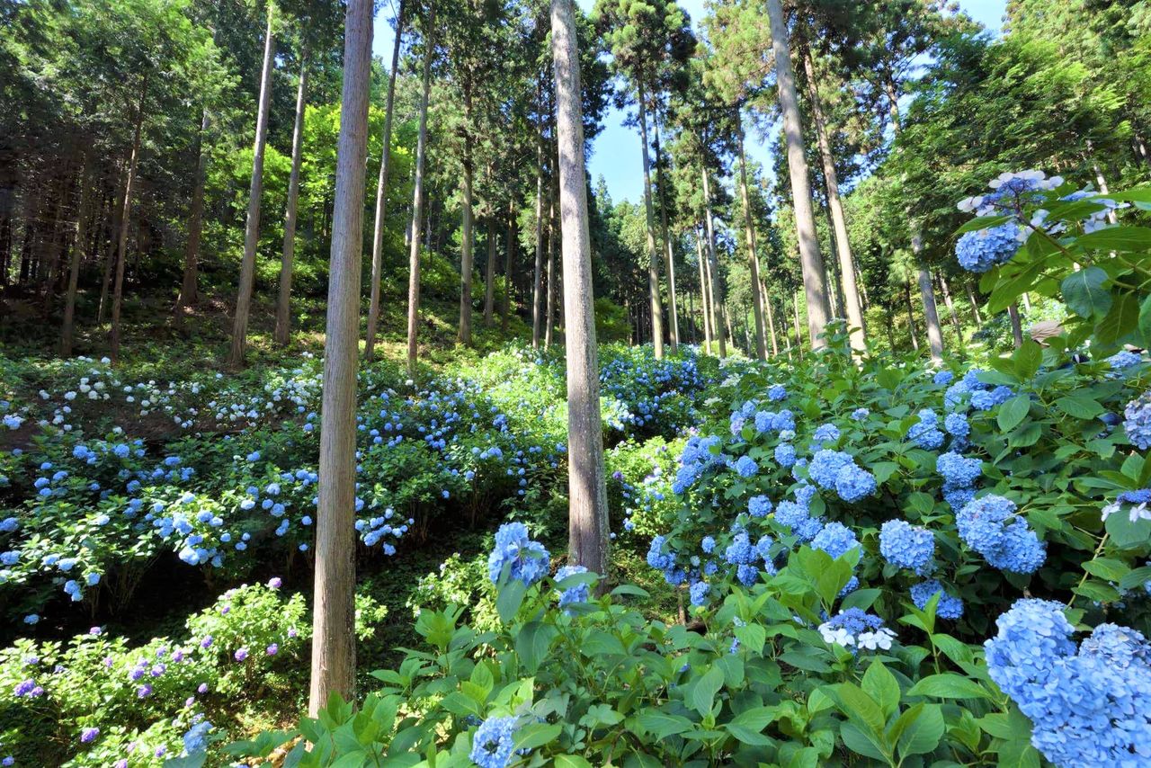 Las hortensias cubren las cuestas del bosque de cedros, a una altitud de 360 metros. Chūichi llevó a cabo el aclareo y la poda. Fotografía: Minamisawa Ajisai-yama.