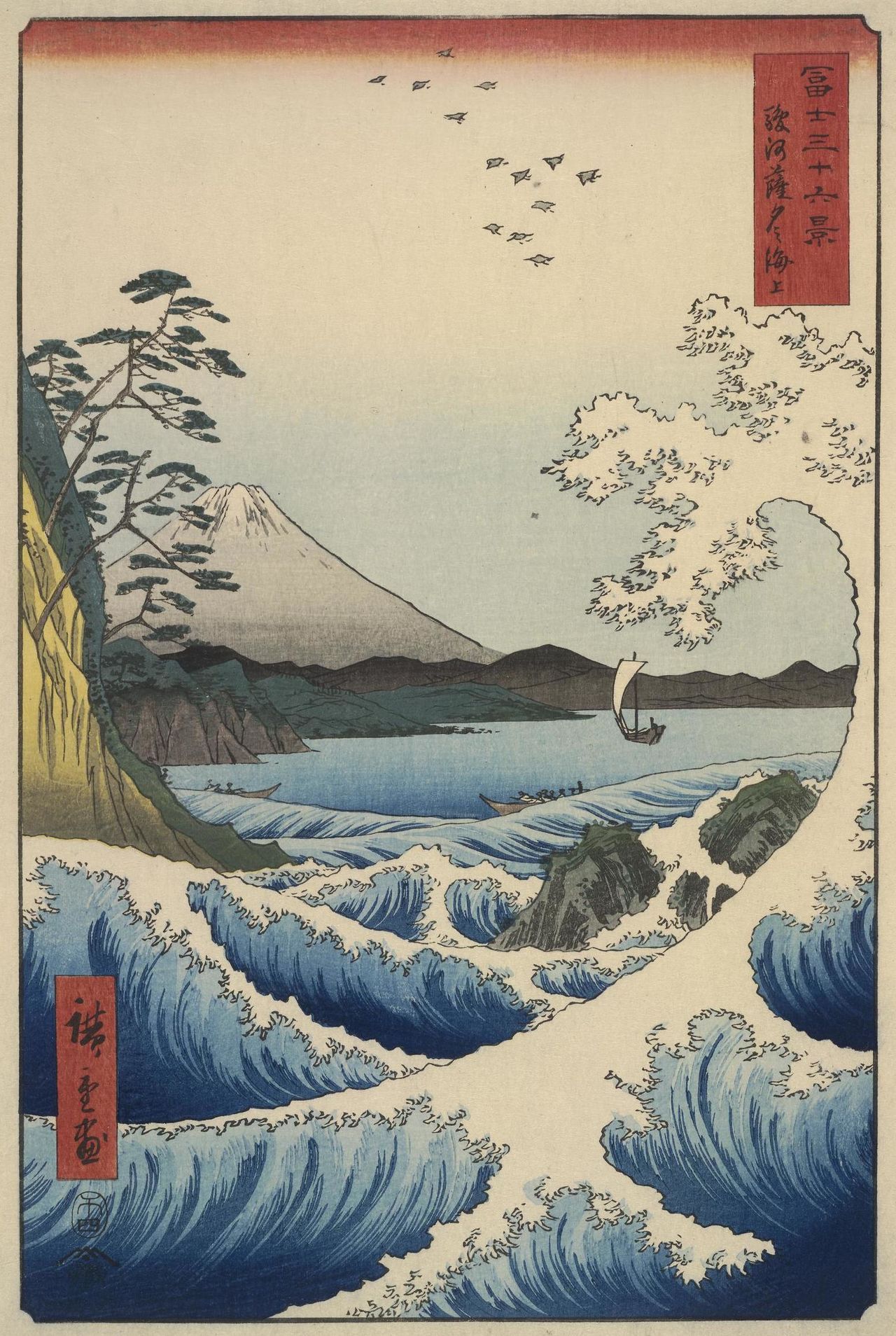 En los últimos años de su vida, el exitoso pintor de parajes famosos Utagawa Hiroshige hizo un homenaje a su antecesor. Utagawa Hiroshige, Las 36 vistas del monte Fuji. El mar en Satta, provincia de Suruga (1858). (Colección del Museo Británico)